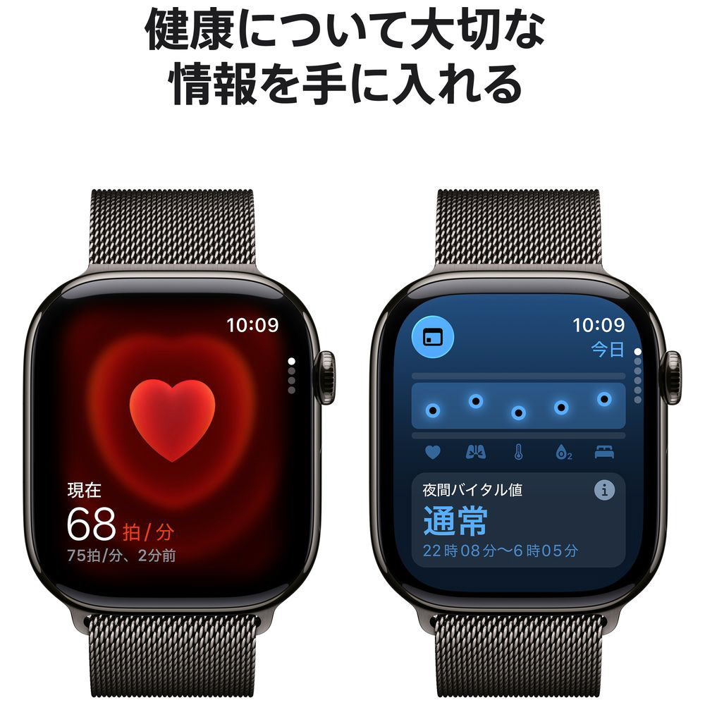 いつでも心電図を記録する。高心拍数と低心拍数、不規則な心拍リズム、睡眠時無呼吸の兆候が検出された場合に通知を受け取る。バイタルアプリで夜間の健康指標を確認する。あなたの体に取り込まれた酸素のレベルをチェックすることもできます。