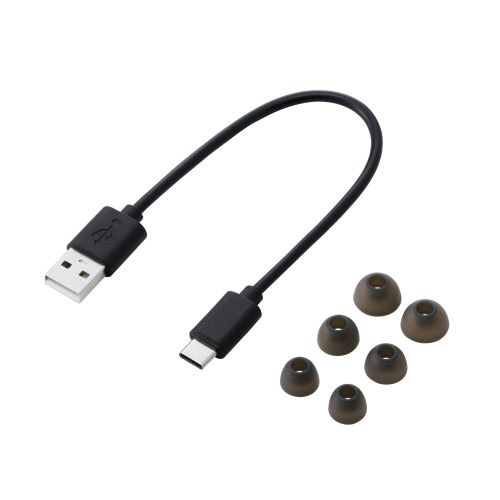 持ち運びやすい長さのUSB-A - USB Type-C(TM)ケーブルが付属しています。イヤーキャップはS/M/Lの3サイズ。耳の大きさや形状に適したサイズが選べるので、落下への心配も少なく使用できます。