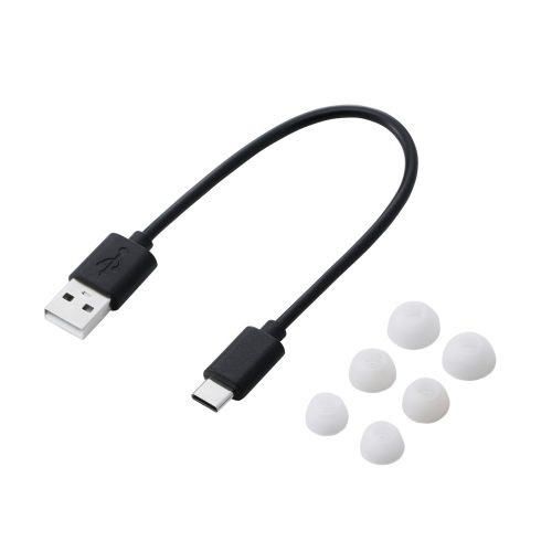 持ち運びやすい長さのUSB-A - USB Type-C(TM)ケーブルが付属しています。イヤーキャップはS/M/Lの3サイズ。耳の大きさや形状に適したサイズが選べるので、落下への心配も少なく使用できます。