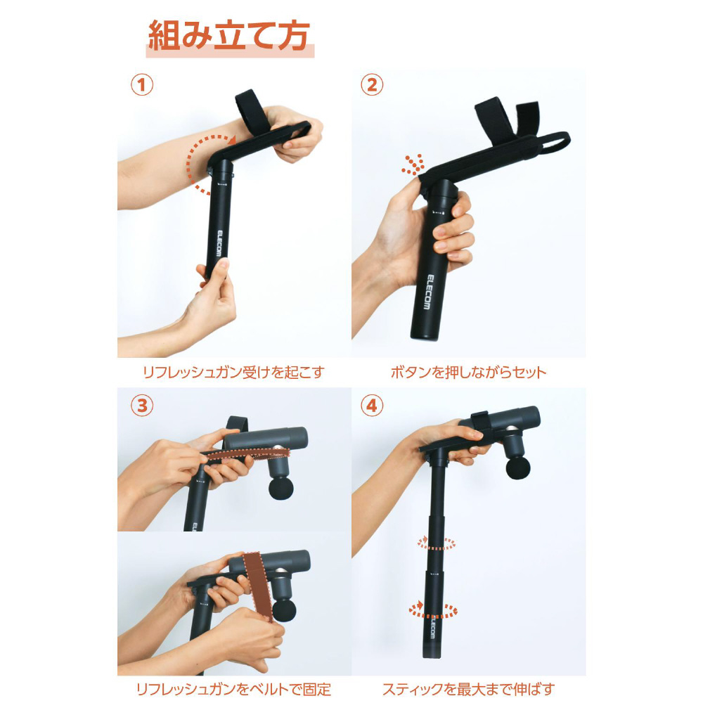 面ファスナー式のベルトで着脱が簡単。持ち手部分の円周が約100〜150mm、アタッチメント装着部から持ち手の底までの長さが約50mm以上のT字型リフレッシュガン・マッサージガンの使用を推奨しています。