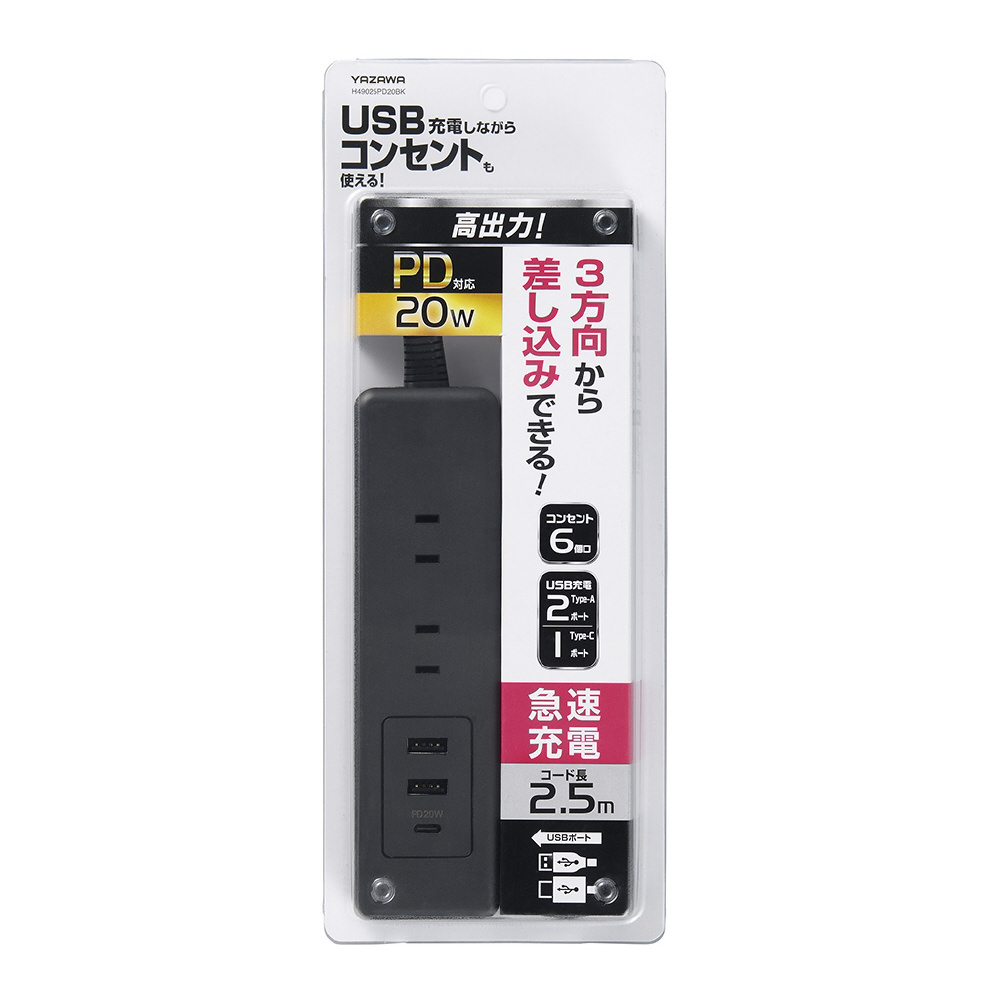 USBタップ6個口PD20W2.5m 黒 H49025PD20BK 高出力PD対応 20W USBポート Type-A×2、Type-C×1 [2.5m /6個口 /スイッチ無 /3ポート]