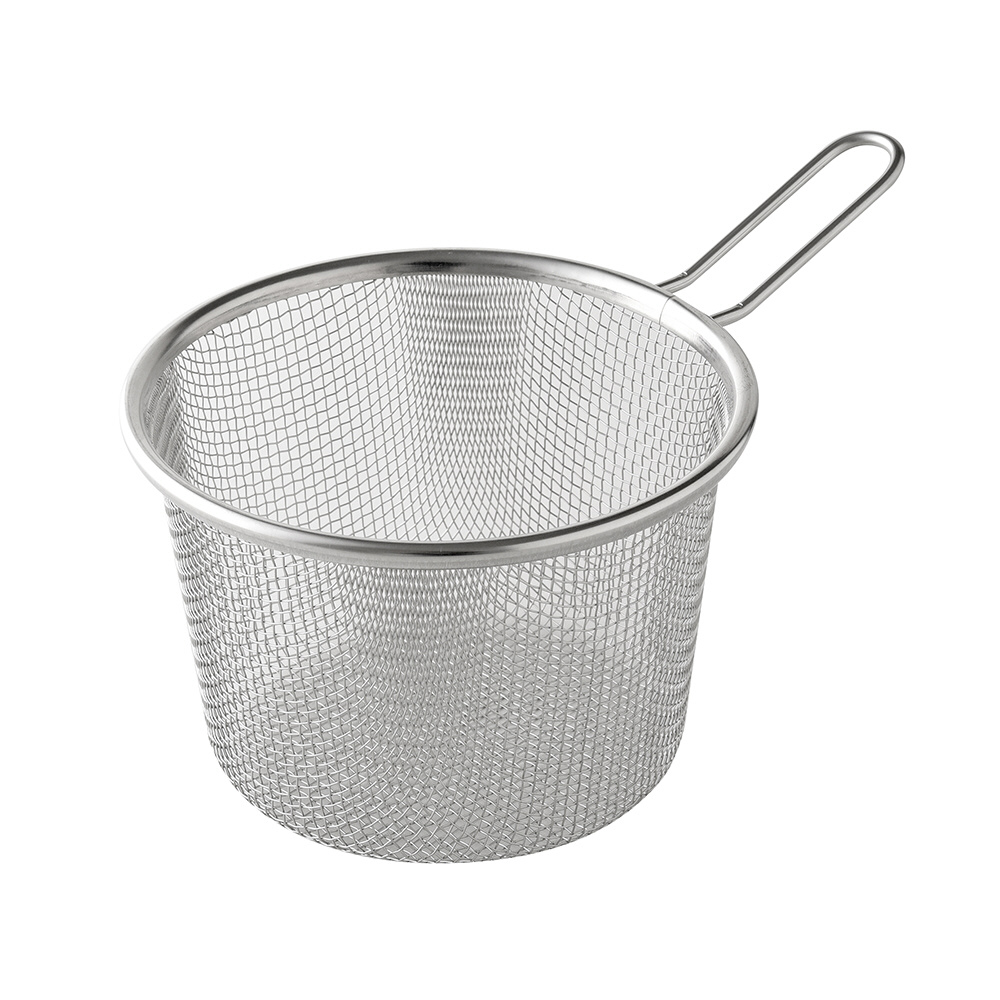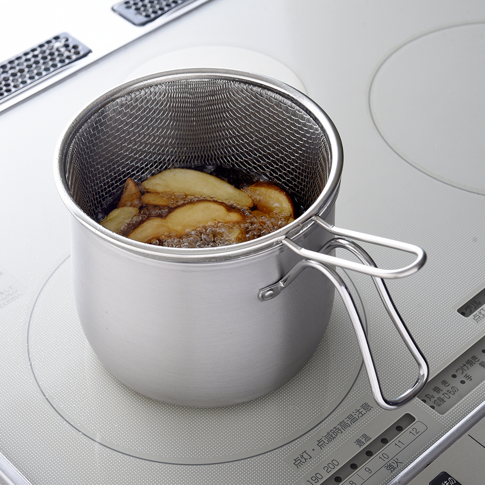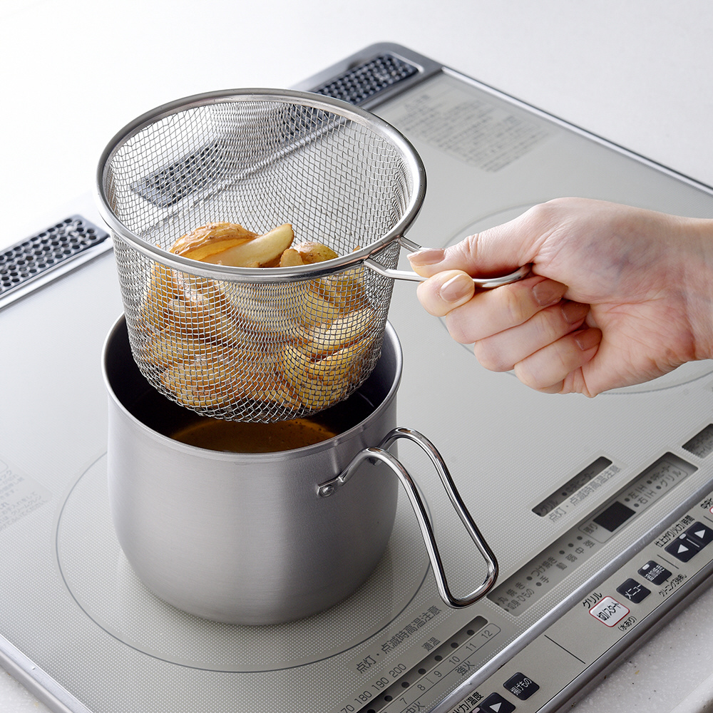ストレーナーでから揚げやフライドポテトなどを一気に引き上げられ、時間差による揚げムラを防ぎます。野菜などを洗ったりザルとして使っても便利です。