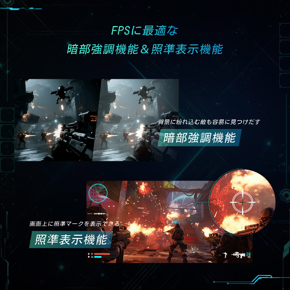 ブラックゲインレベルの調整やガンマカーブの選択によりFPSゲームで重視される暗がりの視認性を向上し、背景に紛れ込む敵も容易に見つけだせます。