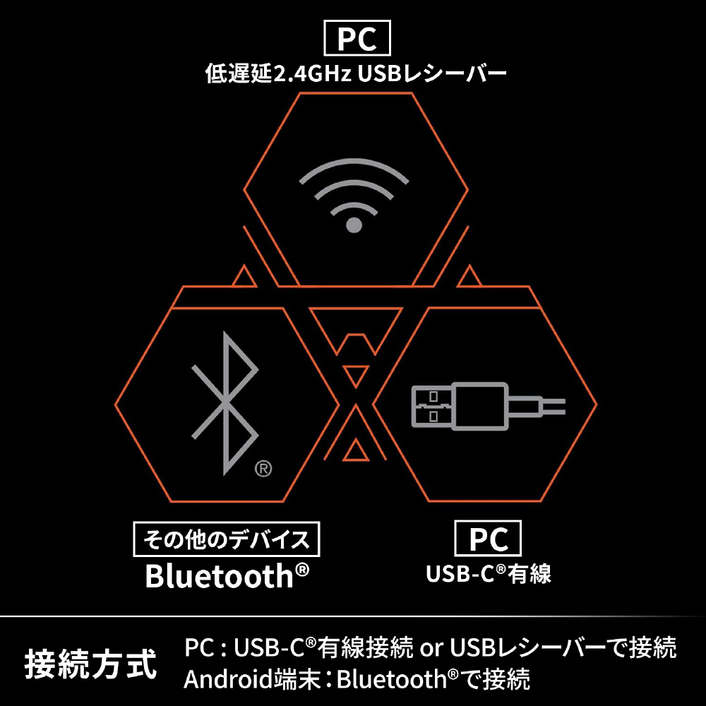 低遅延2.4GHz USBレシーバー、BluetoothまたはUSB-C有線接続の3種類の接続でゲーミングデバイスと接続可能