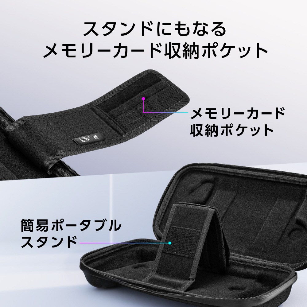 ケース中央にはメモリーカード収納ポケットを搭載。microSDメモリーカード4枚、SDメモリーカード1枚を収納できます。メモリーカードを安全に収納できるだけでなく、折りたたむことで簡易ポータブルスタンドとしても使用可能です。