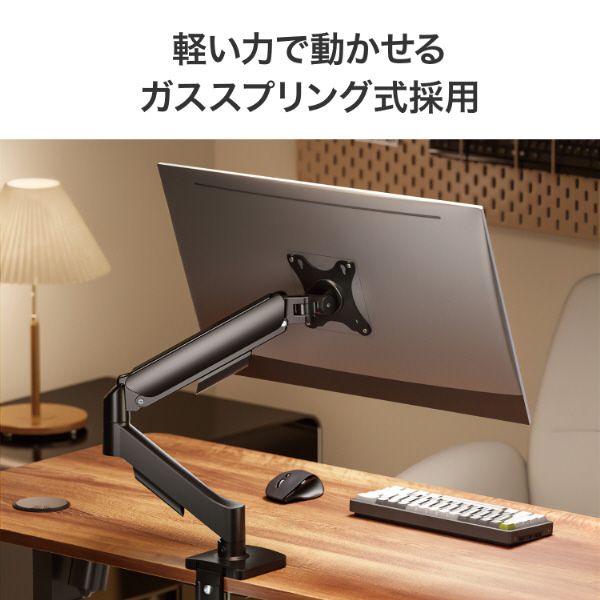 ガススプリング式を採用しているため、軽い力でディスプレイの位置を自在に調整できます。ディスプレイの高さや向きを頻繁に変更したい方に最適です。