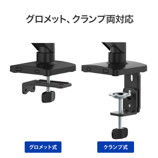 グロメット式(机に穴を開けて固定)とクランプ式(机を挟んで固定)の両方に対応しています。