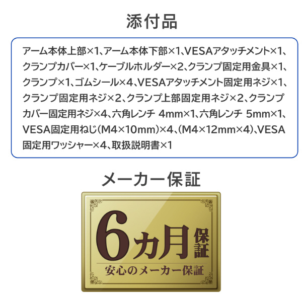 アーム本体上部×1、アーム本体下部×1、VESAアタッチメント×1、クランプカバー×1、ケーブルホルダー×2、クランプ固定用金具×1、クランプ×1、ゴムシール×4、VESAアタッチメント固定用ネジ×1、クランプ固定用ネジ×2、クランプ上部固定用ネジ×2、クランプカバー固定用ネジ×4、六角レンチ 4mm×1、六角レンチ5mm×1、VESA固定用ネジ(M4×10mm)×4、(M4×12mm)×4、VESA固定用ワッシャー×4、取扱説明書