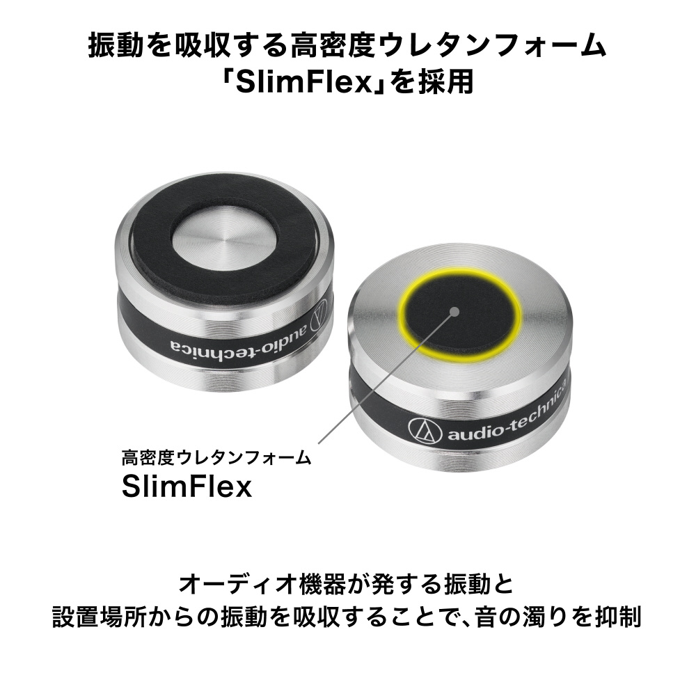 金属を制振材で上下から挟み込むハイブリッド構造を採用。オーディオ機器の底面に設置するだけで、手軽に音質を向上させることができます。