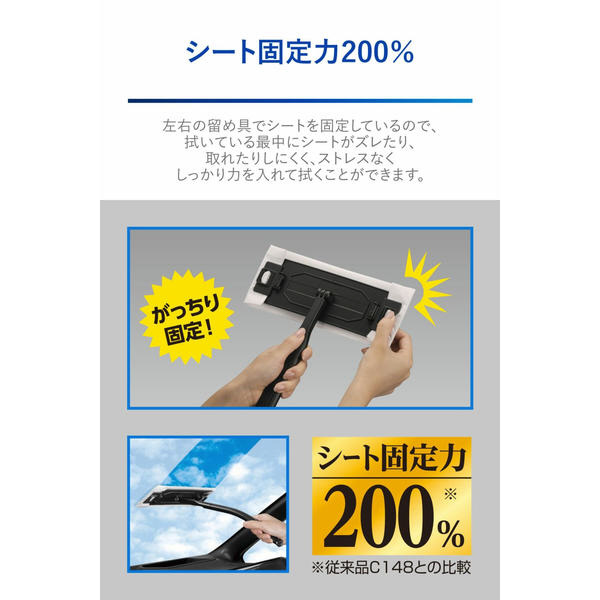 左右の留め具でシートを固定しているので、拭いている最中にシートがズレたり、取れたりしにくく、ストレスなくしっかり力を入れて拭くことができます。