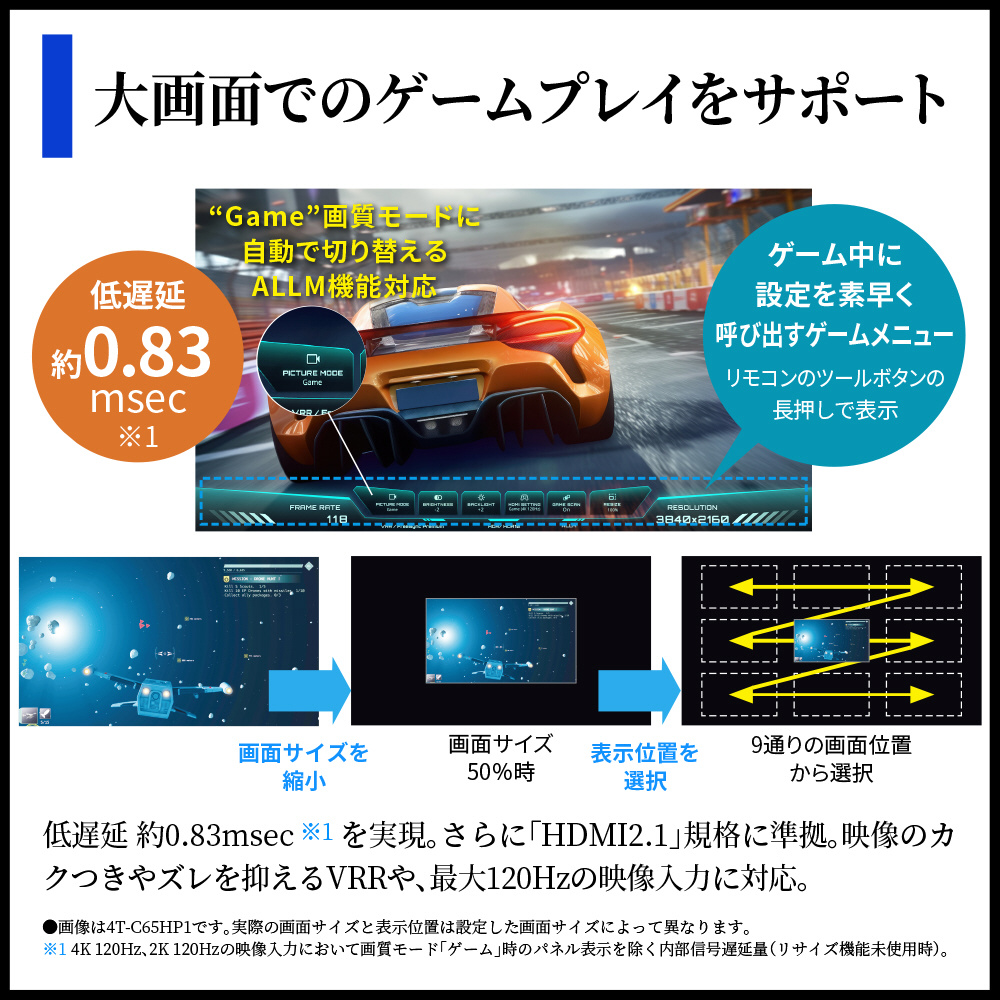 動きの速いゲーム映像を滑らかに表示できます。また、低遅延約0.83msecを実現し、大画面テレビでのゲームプレイをサポート