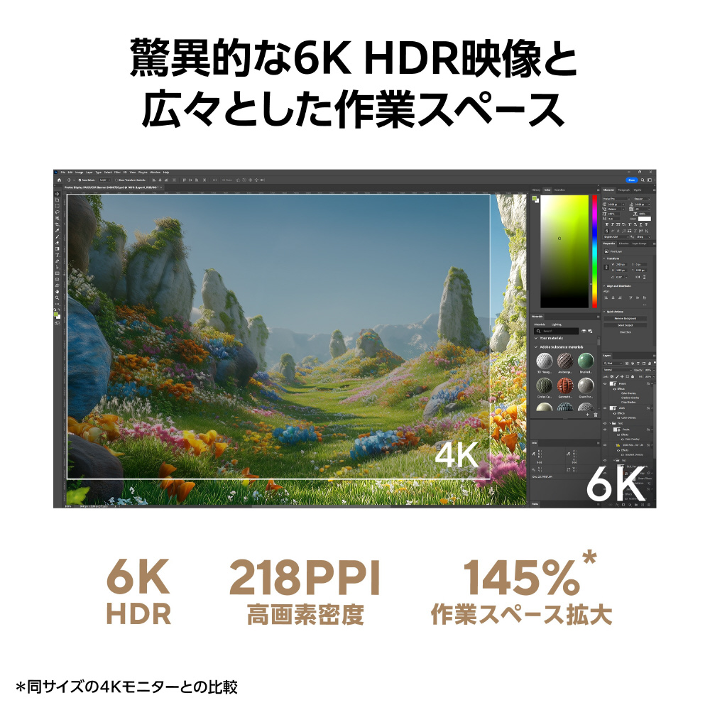 PA32QCVの6K HDR (6016 x 3384) パネルの画素密度は32インチフルHDモニターの3.1倍以上の218ppiです。高画素密度によるハッキリとした読みやすいテキスト表示や鮮明度の向上は細かい作業が必要なプロジェクトに携わるクリエイターにとっても大きなメリットとなります。