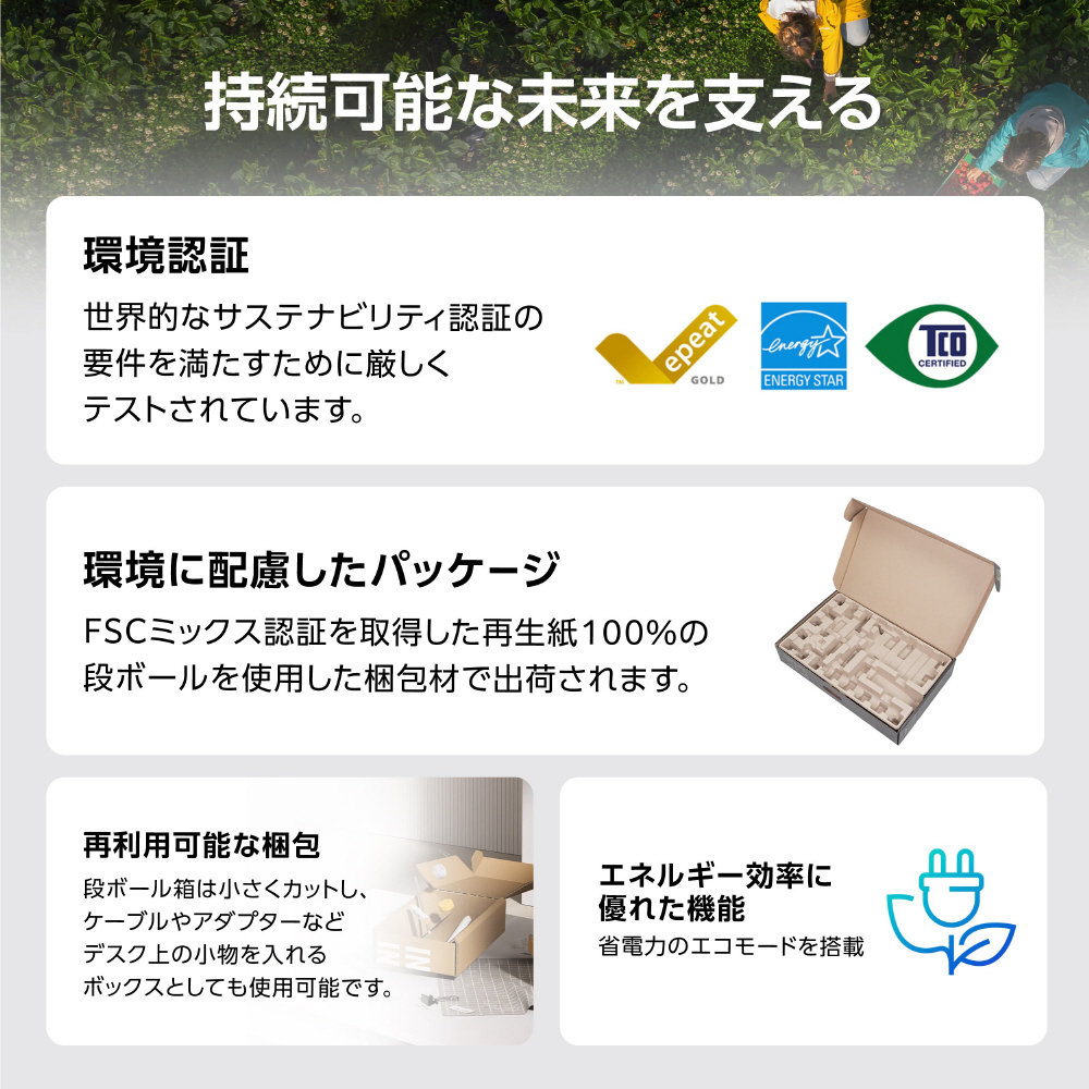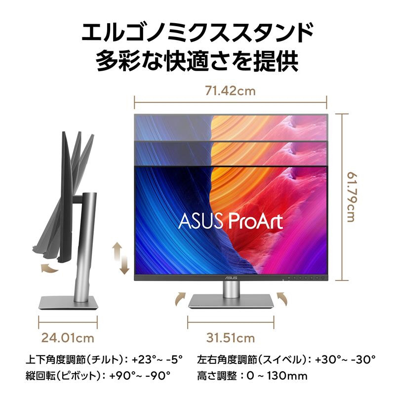 32インチ(31.5インチ表示)、IPS、6K(6016 x 3384)、98% DCI-P3、LuxPixel AGLR、Light Sync、色精度 ΔE < 2、Calman認証取得済み、Thunderbolt 4 96W給電、VESA DisplayHDR 600およびVESA MediaSync、Auto KVM、エルゴノミクススタンド、ASUS DisplayWidget Center、環境サスティナビリティ