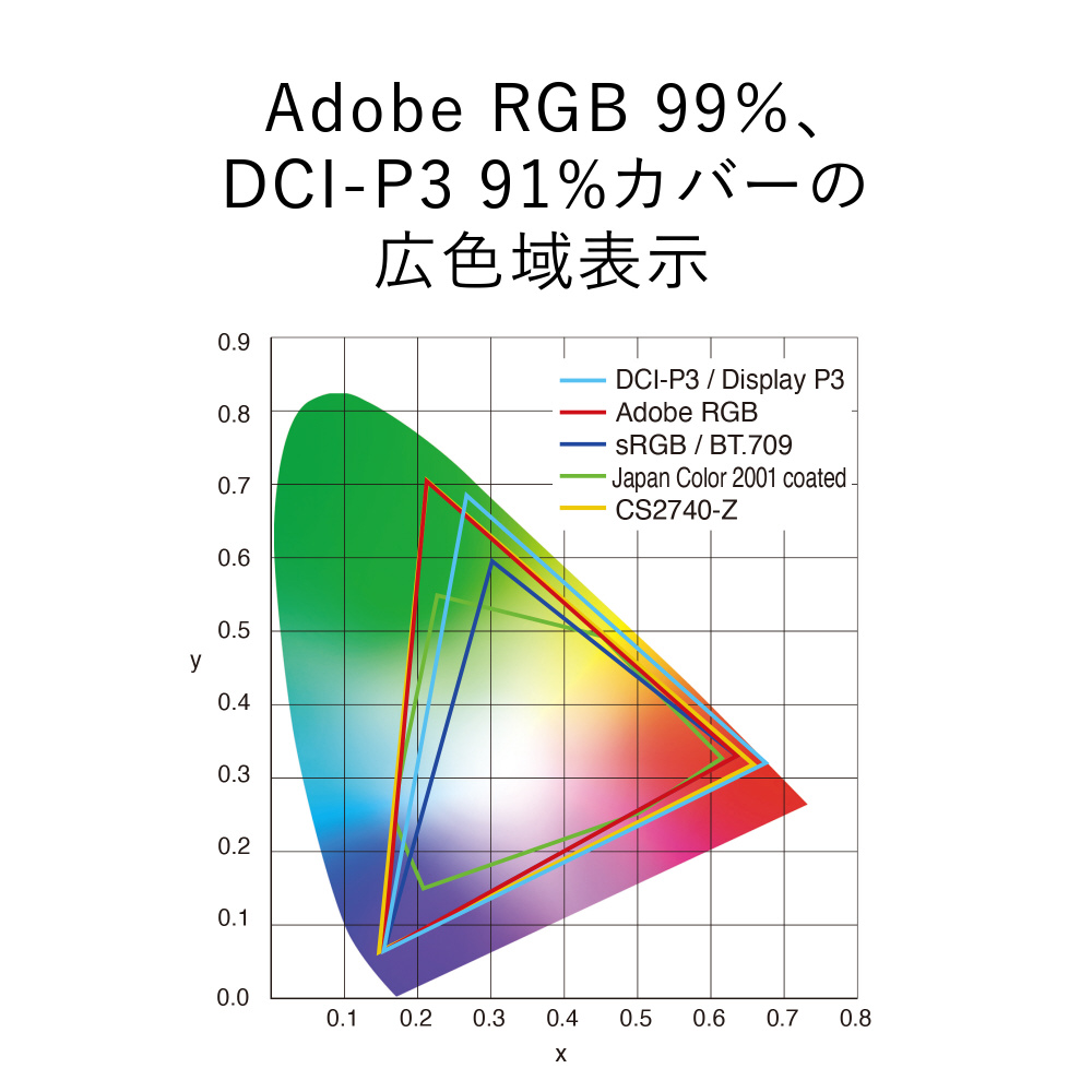 ■DCI-P3色域を90%以上、Adobe RGB色域を99%カバーする広色域表示
