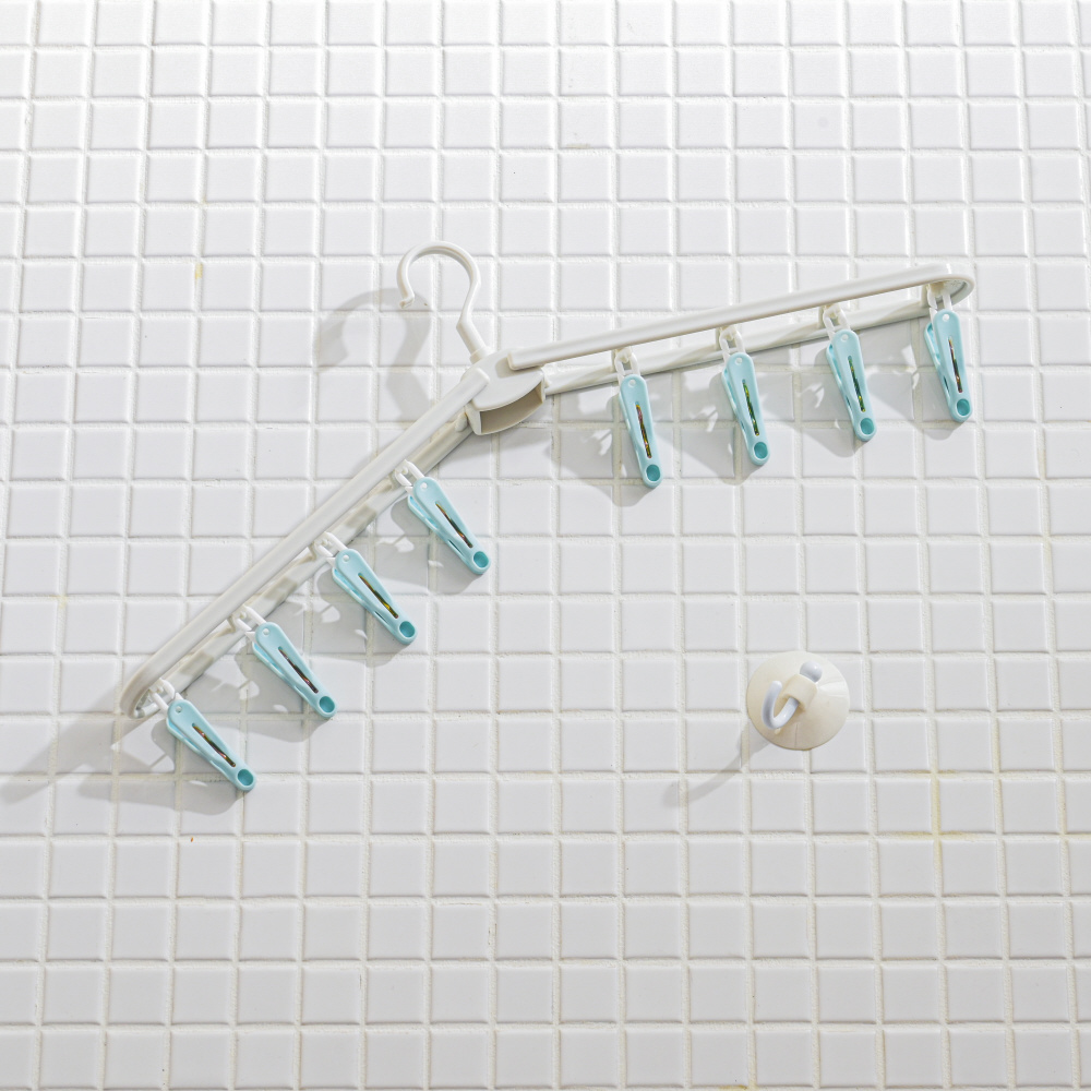 ピンチ8個、吸盤フック1個付きの折りたたみができるハンガーです。