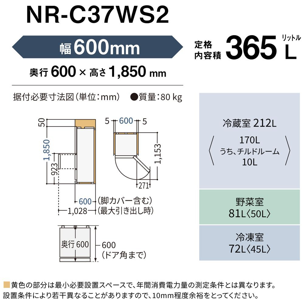 冷蔵庫 WSタイプ ストーンブラック NR-C37WS2L-K [60.0cm /365L /3ドア /左開きタイプ /2025年]