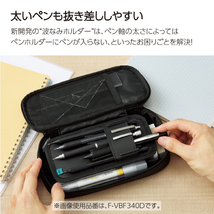 ●オリジナル設計の「波なみホルダー」は、柔軟性のある波型の仕切りが大切なペンを守り、太軸やグリップ付きのペンも抜き差ししやすい。