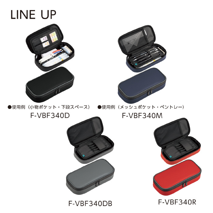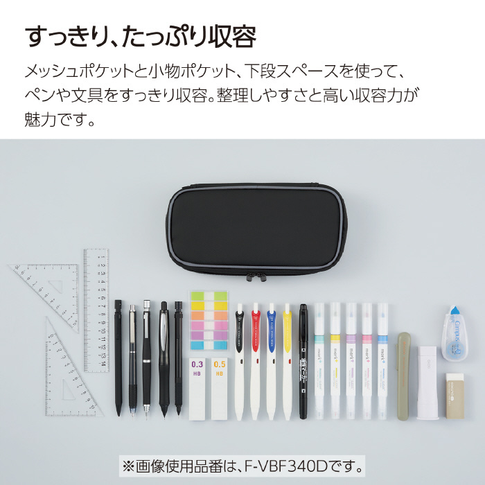 ●収容するアイテムに合わせたさまざまなサイズのポケット。フタ裏には定規などが入るメッシュポケット、ペントレー裏にはシャープ替芯2個とふせんが入る薄型ポケット。下段は消しゴムや修正テープ用の小物スペースと約15本のペンが収容できる大スペースに仕切られているため、整理しやすく取り出しやすい。●丈夫なコーティング生地にクッション材を内蔵し、周囲にパイピングを施した、耐久性と高級感にこだわったデザイン。
