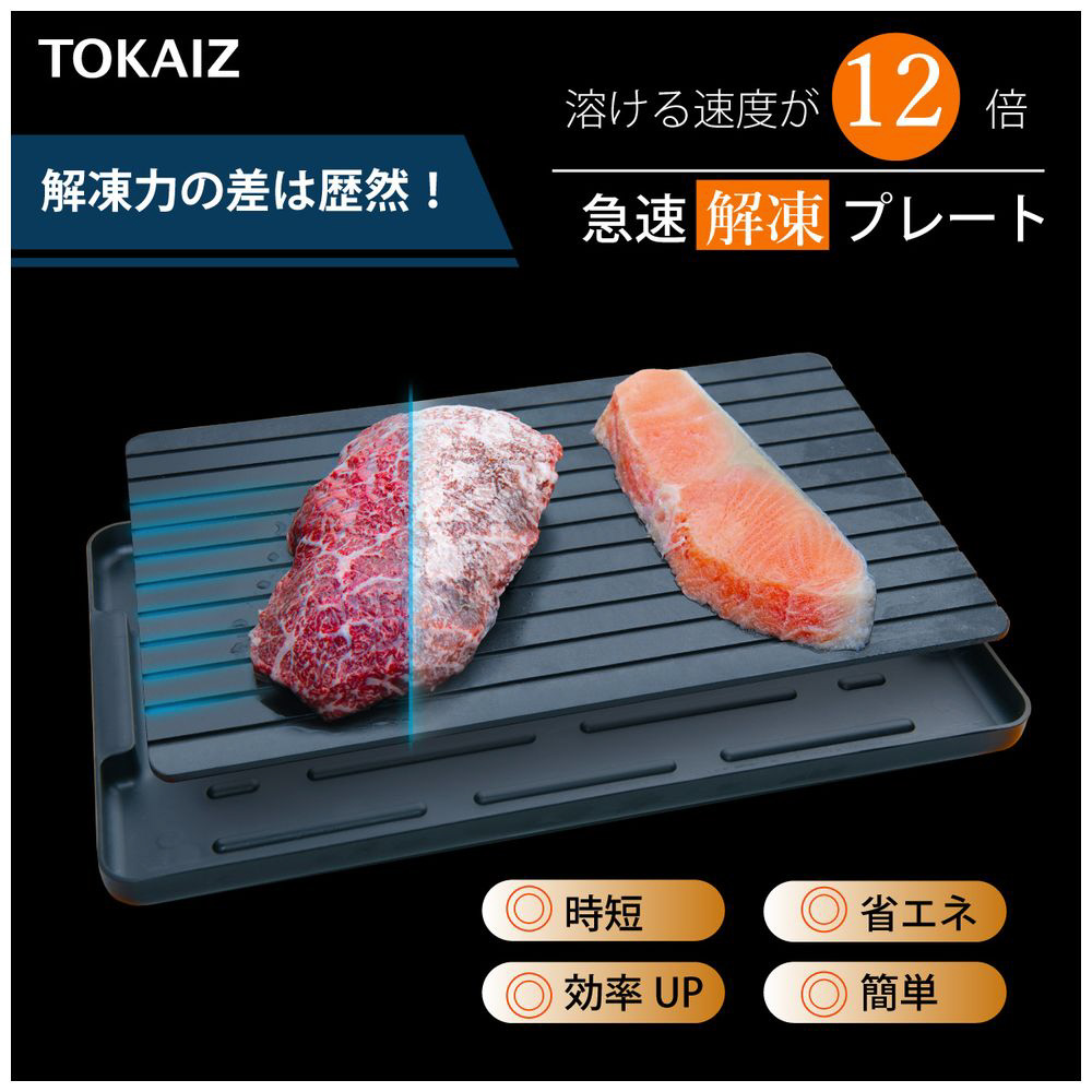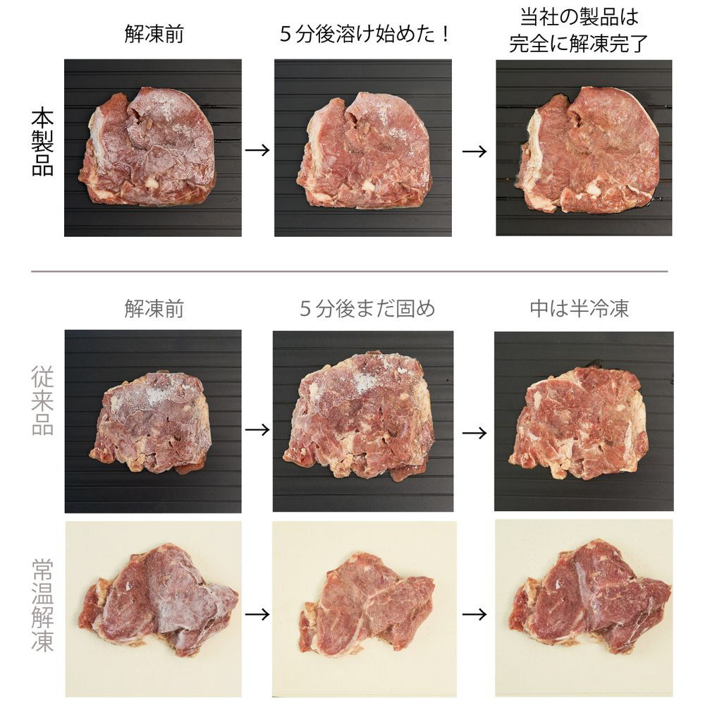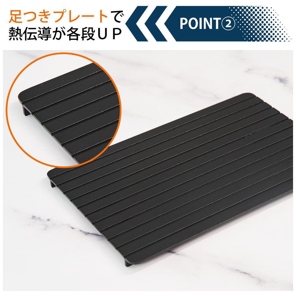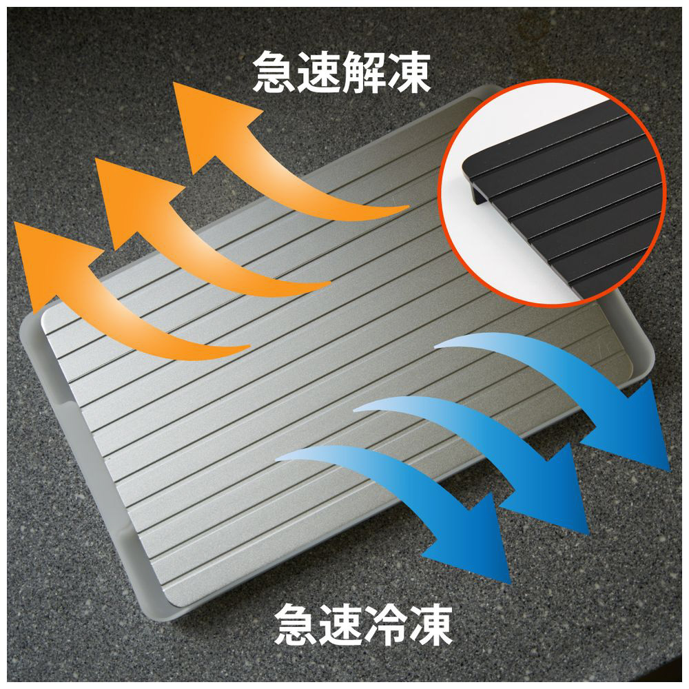 電気不要で省エネ!解凍プレートは12倍速で肉・魚・野菜を瞬時に解凍し、美味しさを逃さずキープ。出た水はサッと付属のトレーに流せて後片付けも簡単。