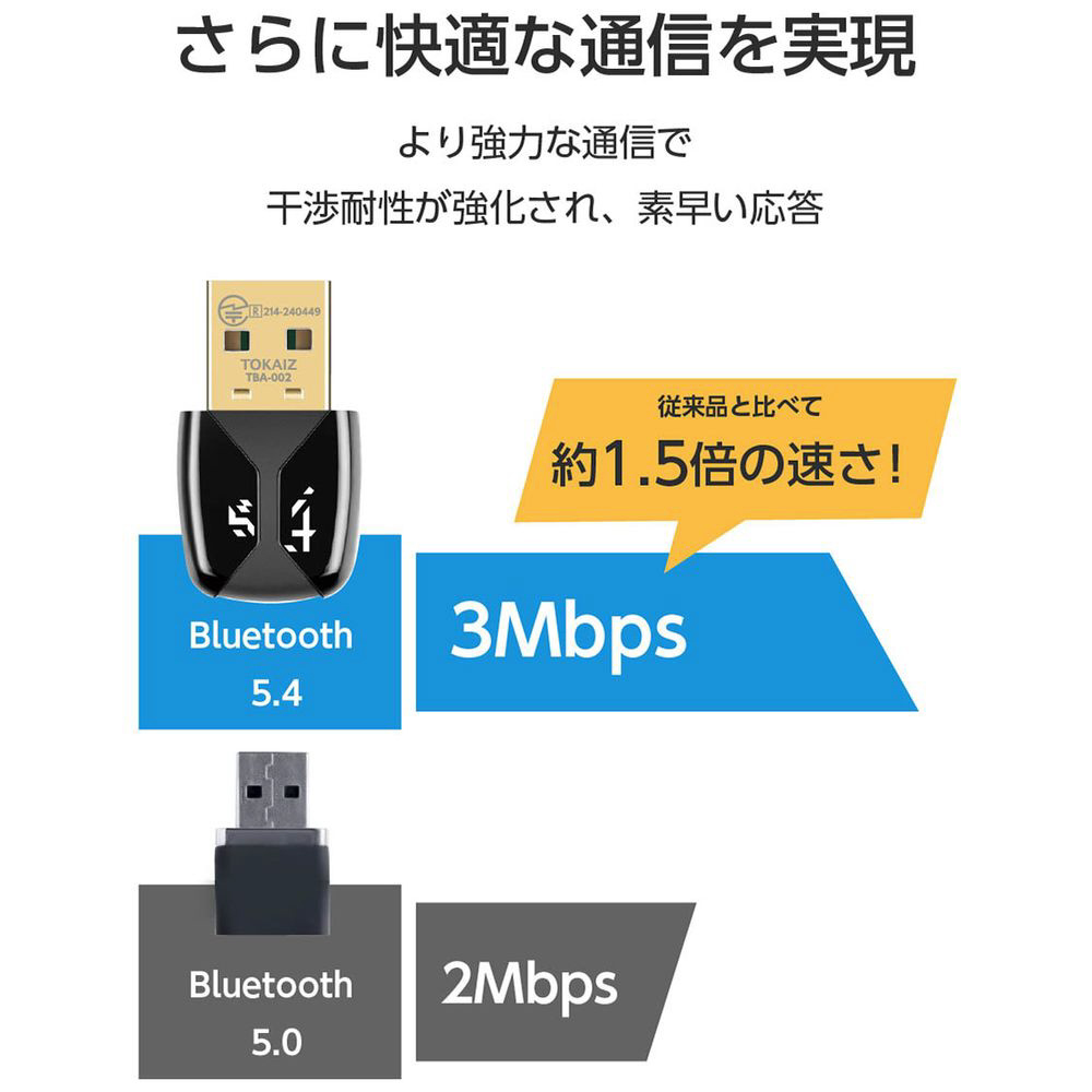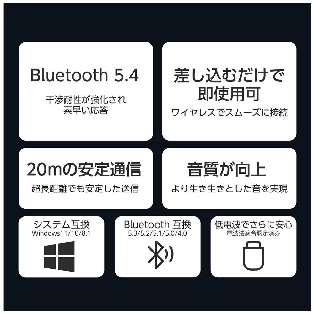 無線設備適合認証済み&日本語説明書付き。Bluetooth5.0/5.1/5.2/5.3/5.4対応で最大通信距離20m、マウスやキーボードなど最大7台のデバイスを同時接続可能。