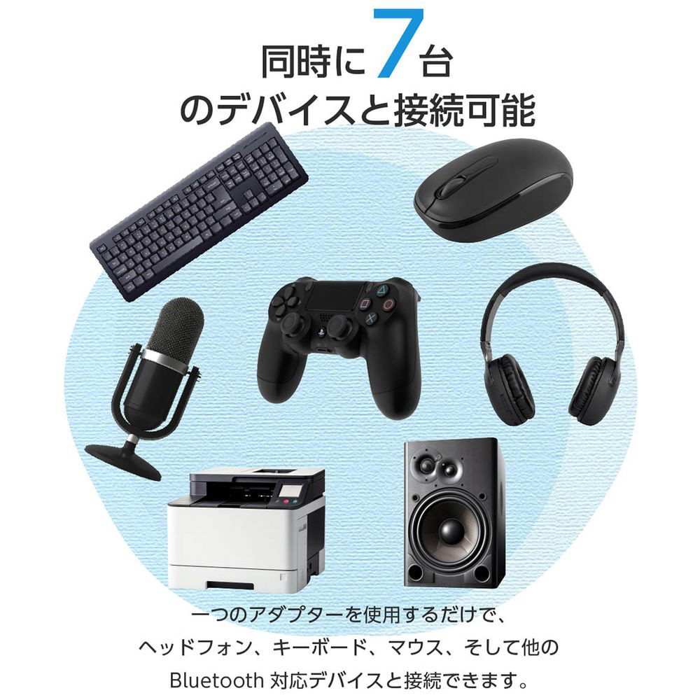 1つのアダプターでヘッドフォン・キーボード・マウスなど、最大7台のデバイスを同時接続可能。効率的なマルチデバイス環境を実現します。