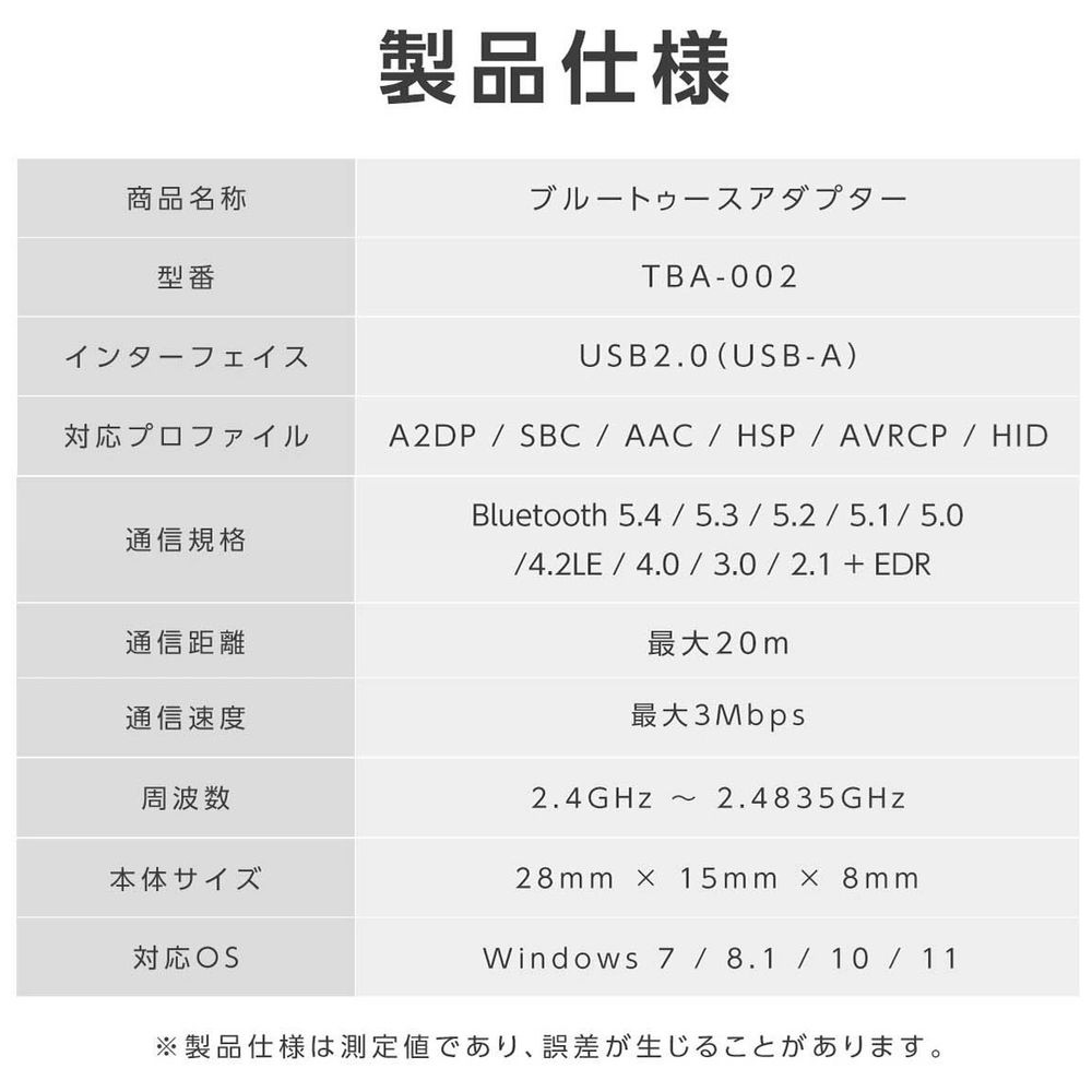 ブルートゥース アダプター [USB-A /Bluetooth 5.4] (Windows11対応) TBA-002
