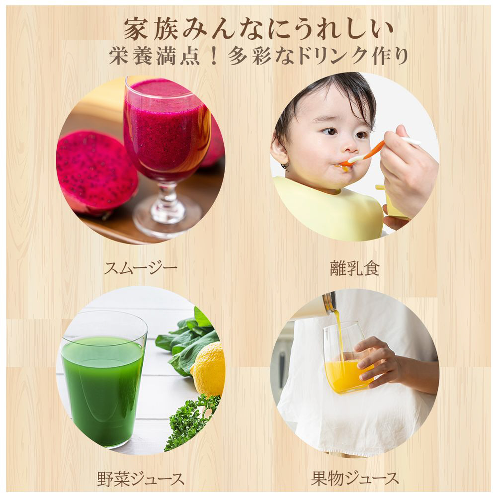 スムージーはもちろん、離乳食や介護食作りにも対応。毎日の健康習慣をおいしく手軽にサポートします。