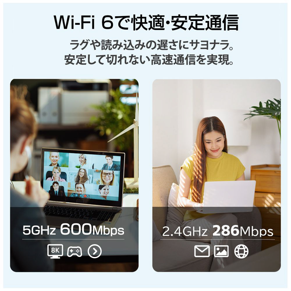 次世代通信規格「Wi-Fi6(AX)」に対応。5GHzで最大600Mbps、2.4GHzで最大286Mbpsの高速通信を実現し、動画視聴やオンラインゲームも快適です。