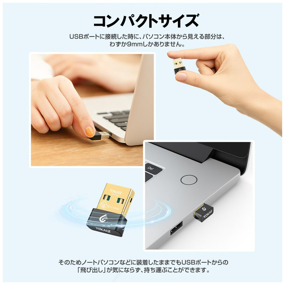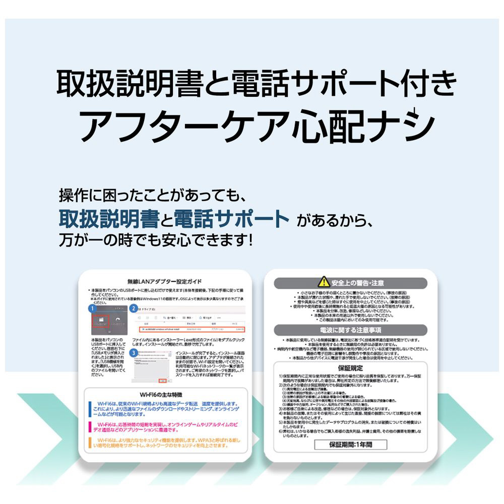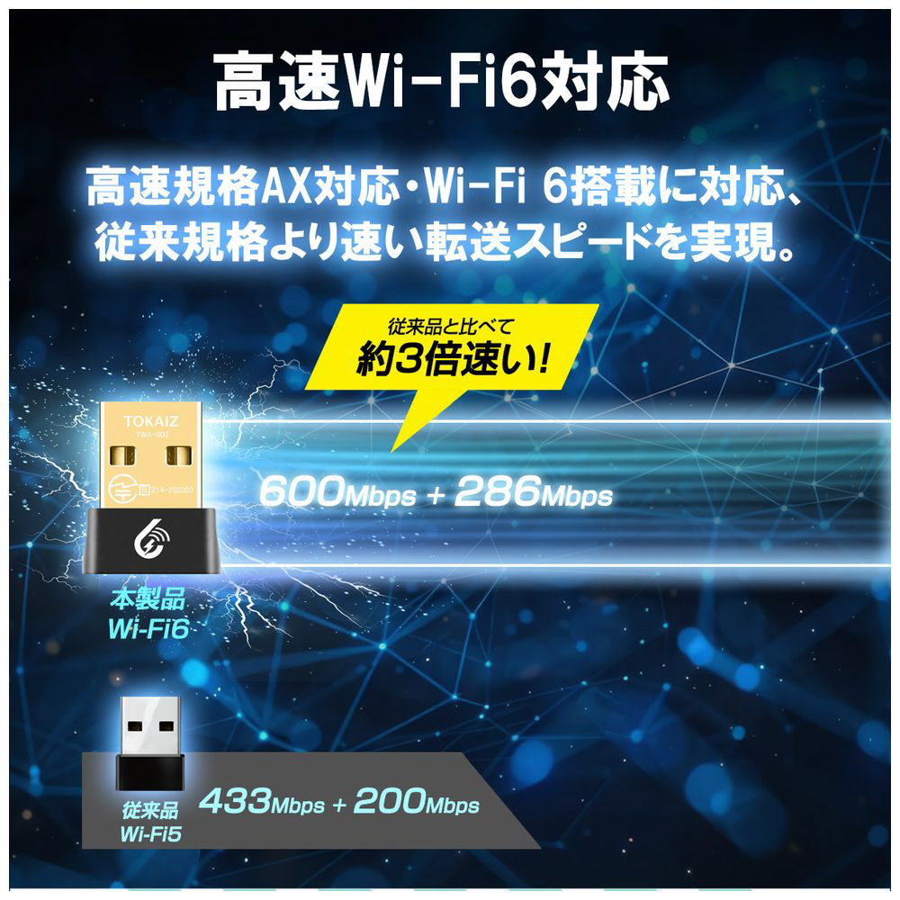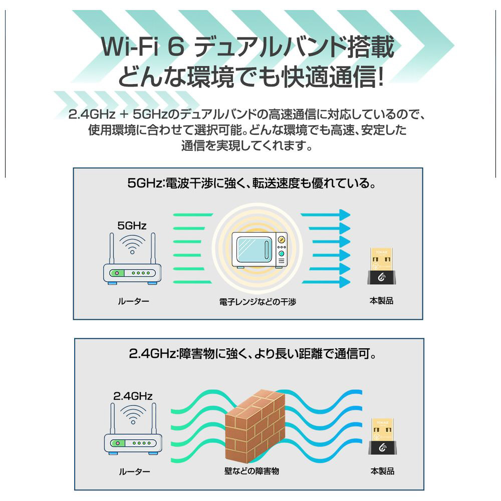 超小型ながら高速600Mbps+286Mbps、2.4GHz+5GHz対応でAX Wi-Fi6サポート。無線設備適合認証済み&日本語説明書付き、コンパクトで持ち運びにも便利なWi-Fiアダプター。