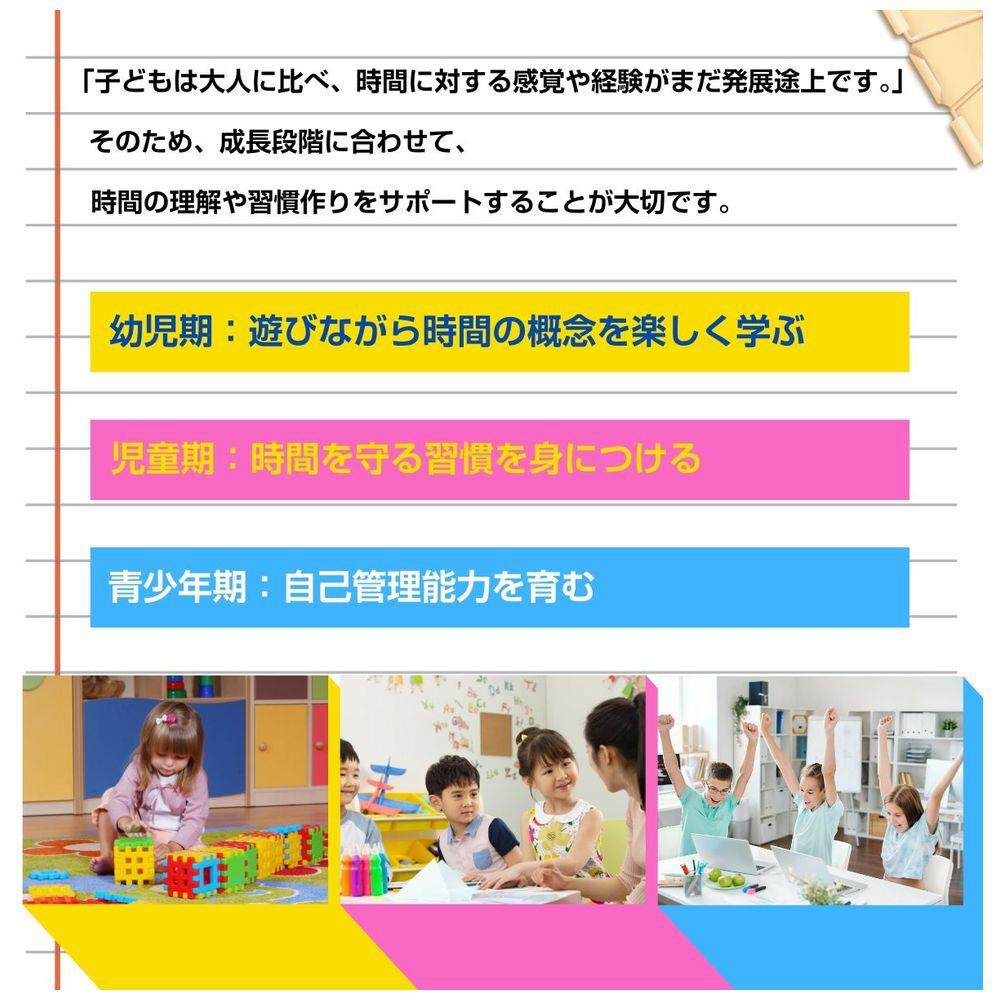 色彩心理を活かした表示で、時間の経過をひと目で把握可能。小さなお子さまでも視覚的に理解しやすい設計です。