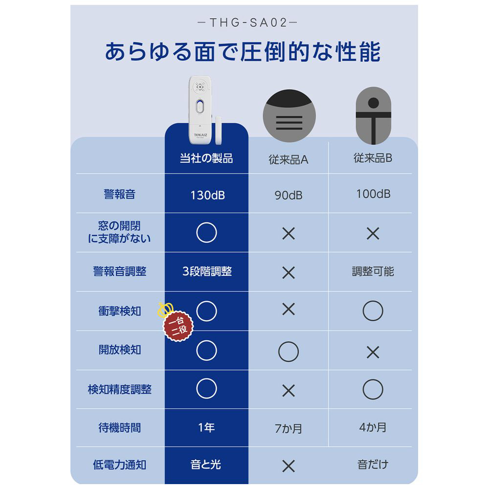 進化モデル!薄型設計でほとんどの窓に対応、空き巣対策に最適な防犯パートナー。開放検知と衝撃検知のダブル機能を搭載し、電池交換不要で1年間使える手軽さと爆音アラームで家族の安全を守ります。