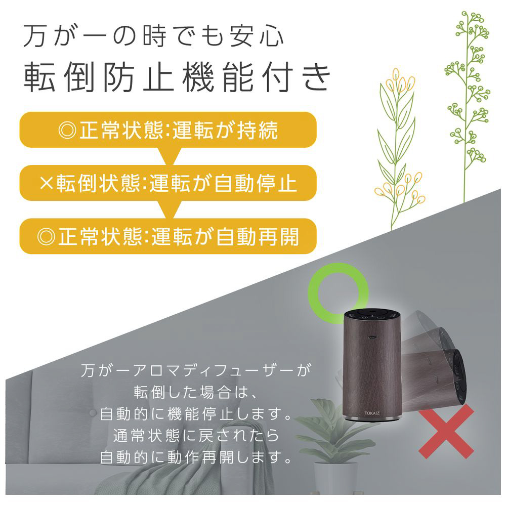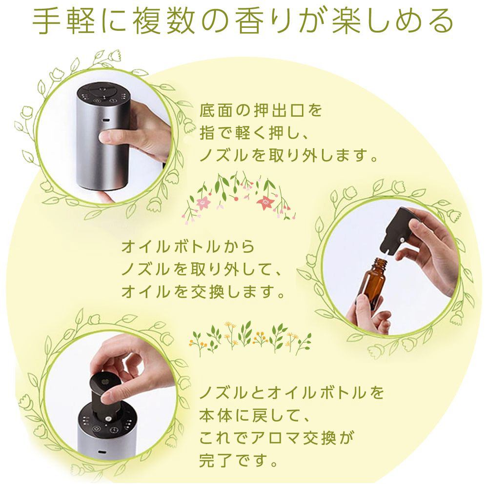 面倒な給水やお手入れが不要。精油やフレグランスをそのまま使用でき、清潔かつ手軽に香りを楽しめます。