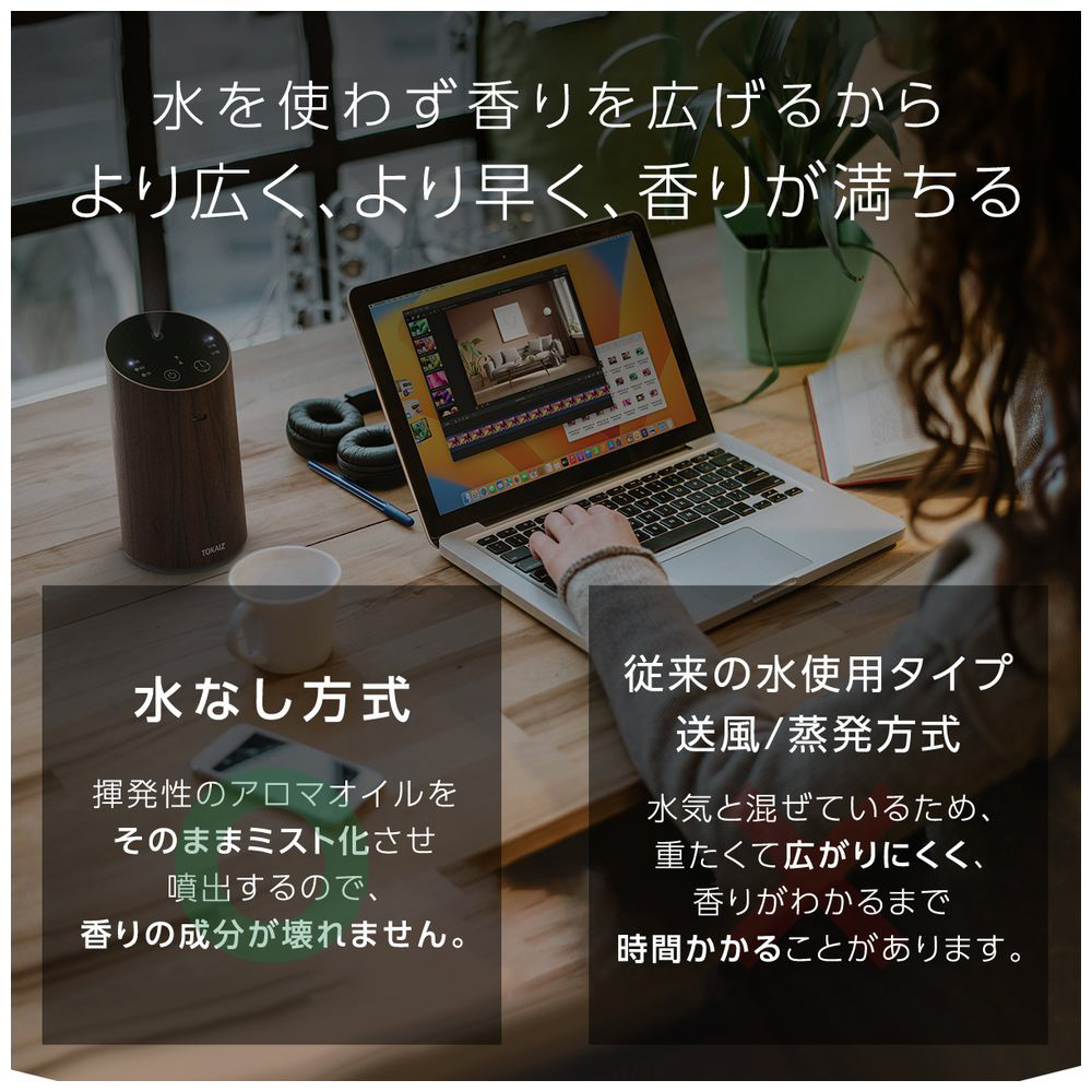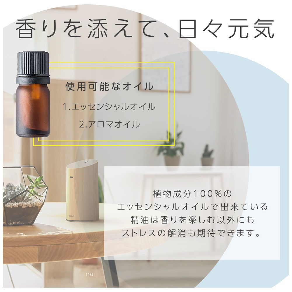 面倒な給水やお手入れが不要。精油やフレグランスをそのまま使用でき、清潔かつ手軽に香りを楽しめます。