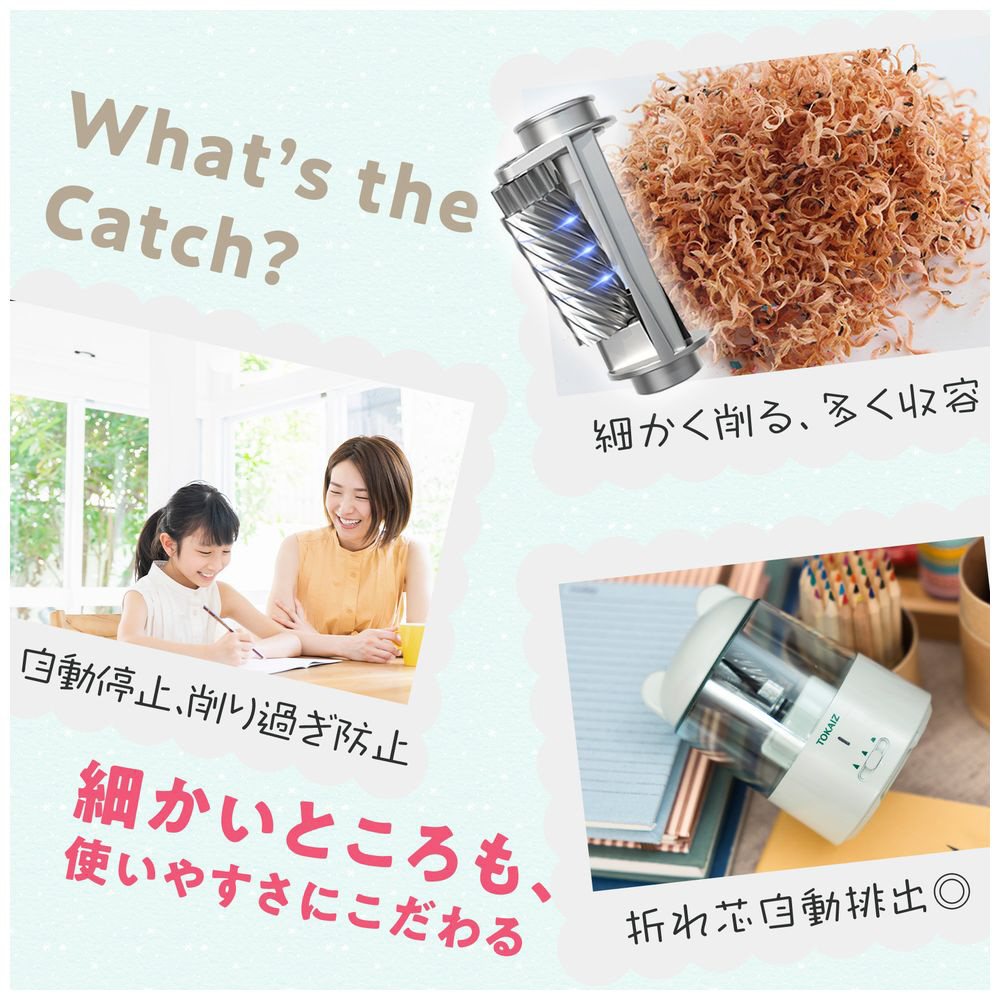 鉛筆を差すだけで一瞬できれいに削り上げ。毎日の手間を減らし、勉強や仕事の時間を効率化します。