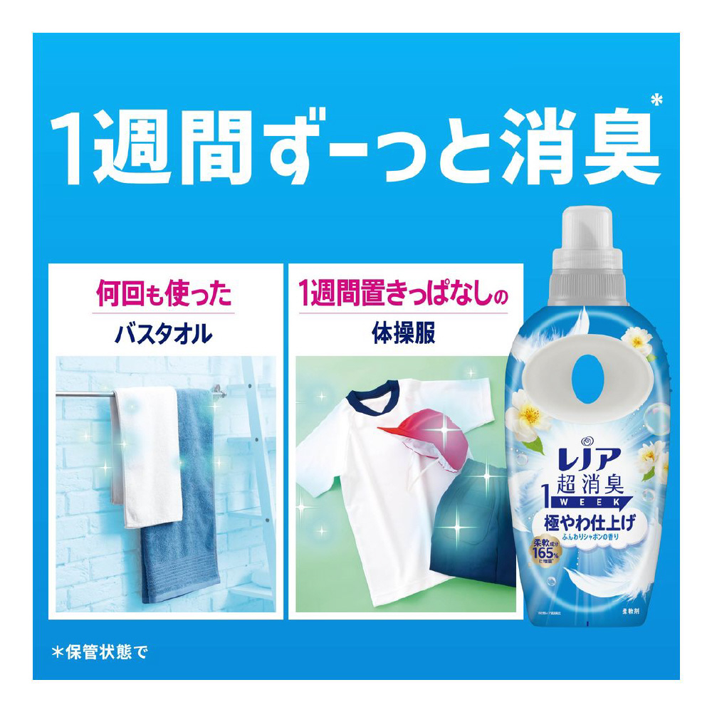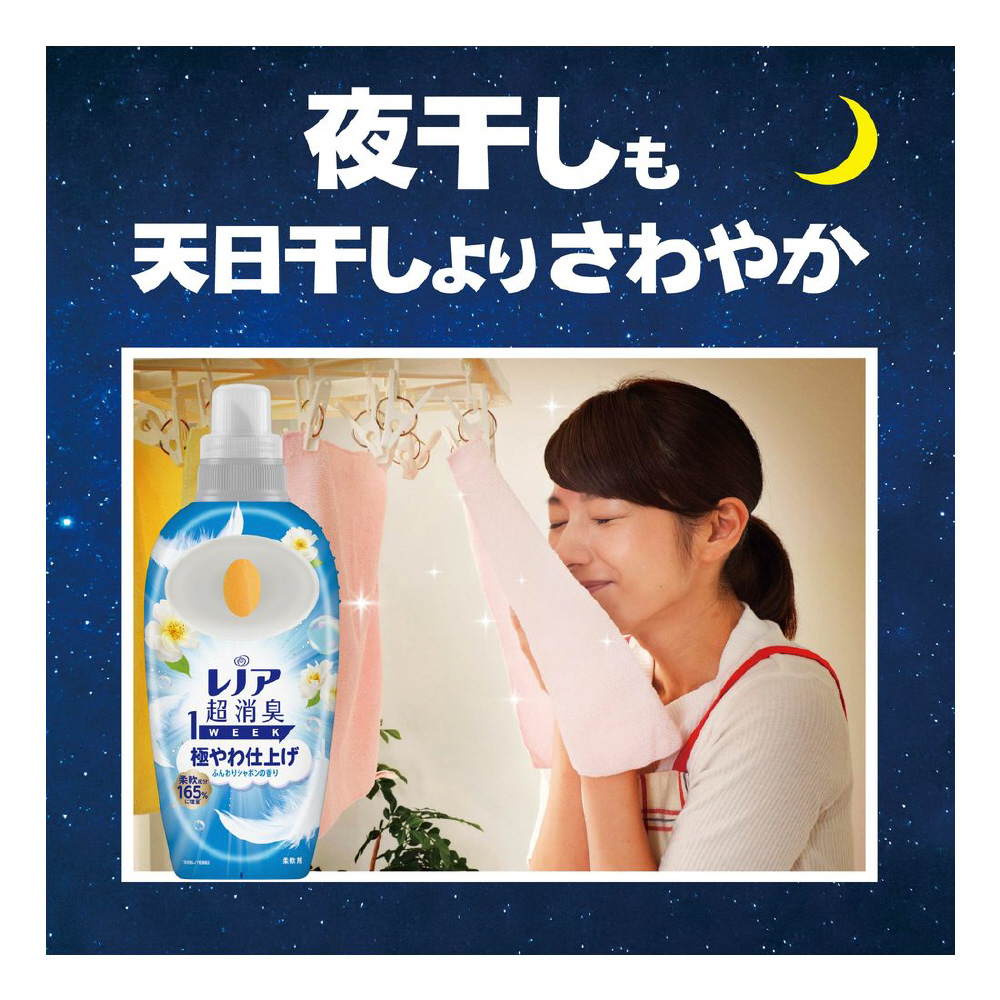 柔軟成分165%に増量*1 1週間ずーっと消臭*2 花粉ブロック*3 静電気ブロック部屋干しでも生乾き臭を防ぐ洗濯槽のニオイを防ぐ赤ちゃんの衣類もやわらかく *柔軟剤未使用と比較。すべてのニオイを0にするわけではありません *1 当社他レノア超消臭比 *2 保管状態で *3 静電気を防ぐ効果による 柔軟剤