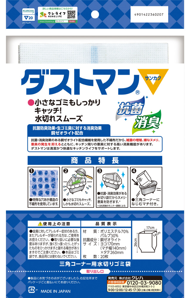 抗菌効果のある繊維を使用した三角コーナー用の水切りゴミ袋です。
