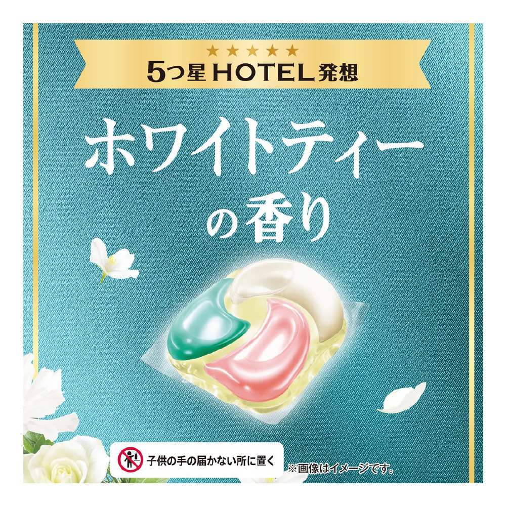 5つ星HOTEL発想 ホワイトティー&フローラルの香り柔軟剤効果 4 in 1強洗浄 洗い上がり輝く白さシワ *1 &黄ばみ防止 *1  アイロンがけが楽に! *1ふんわり仕上げ 驚きの柔らかさ香り長続き 着ている間も華やか消臭成分2倍濃縮 *2*1 弊社他洗剤比、平均洗濯物量(P&G調べ)比