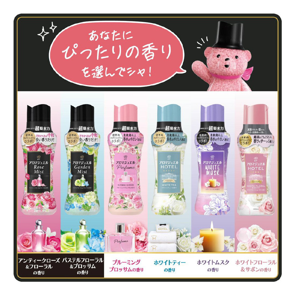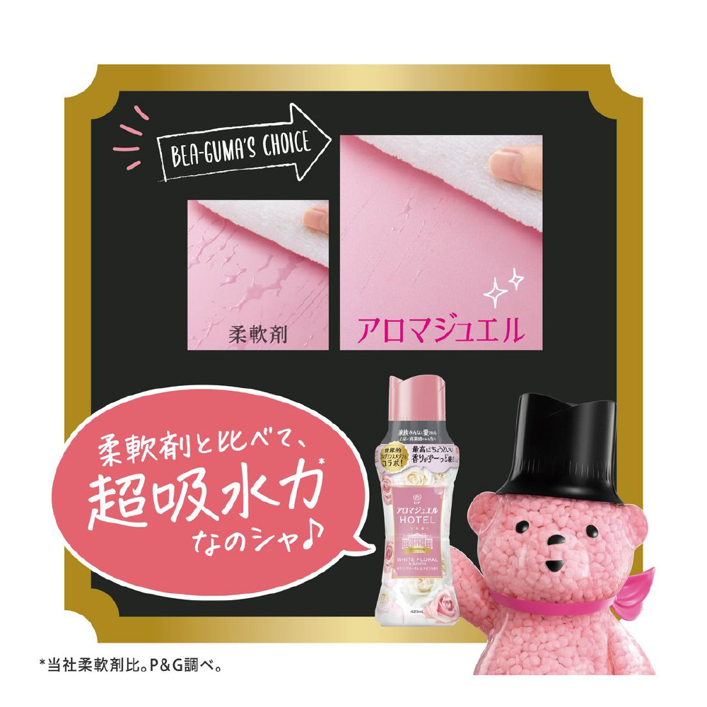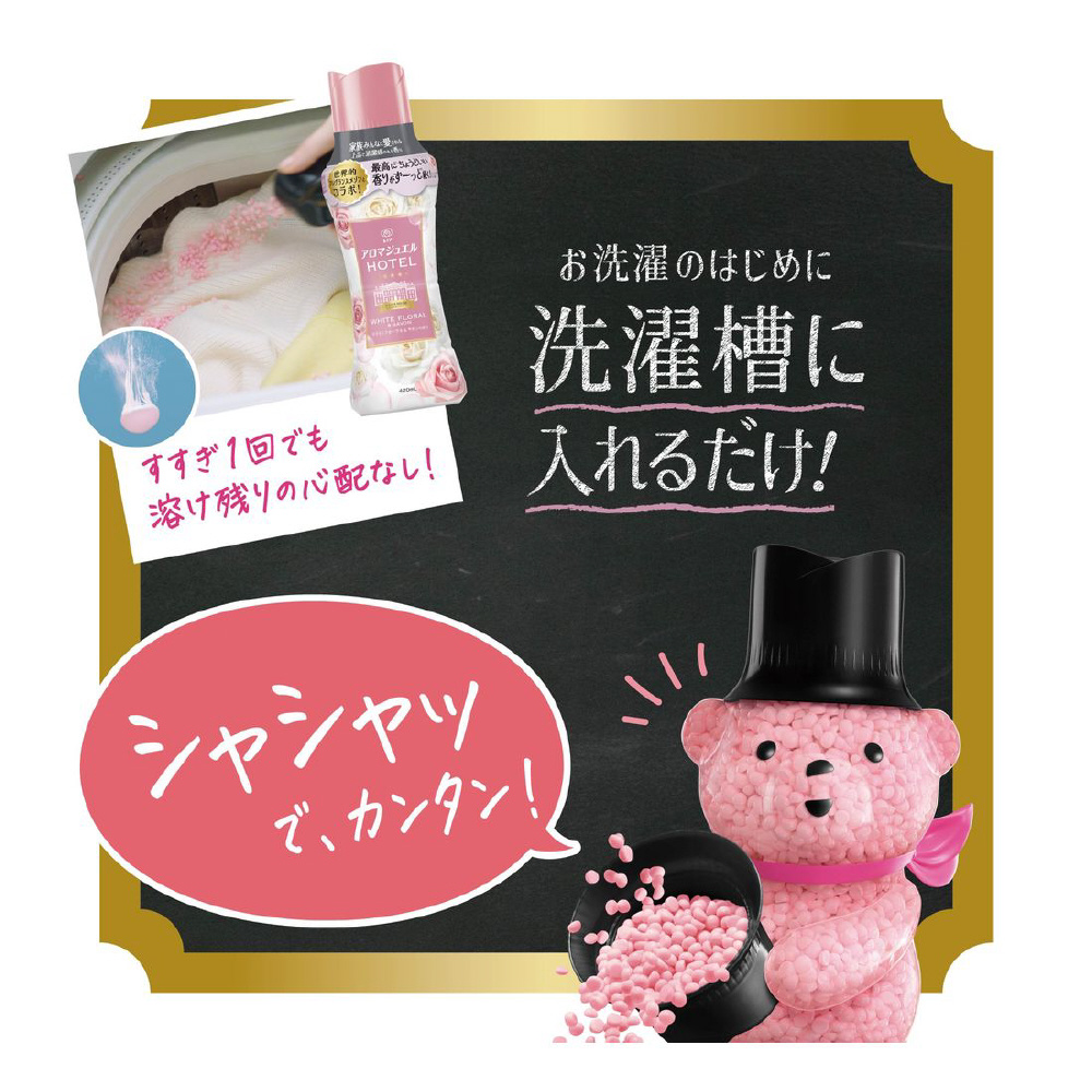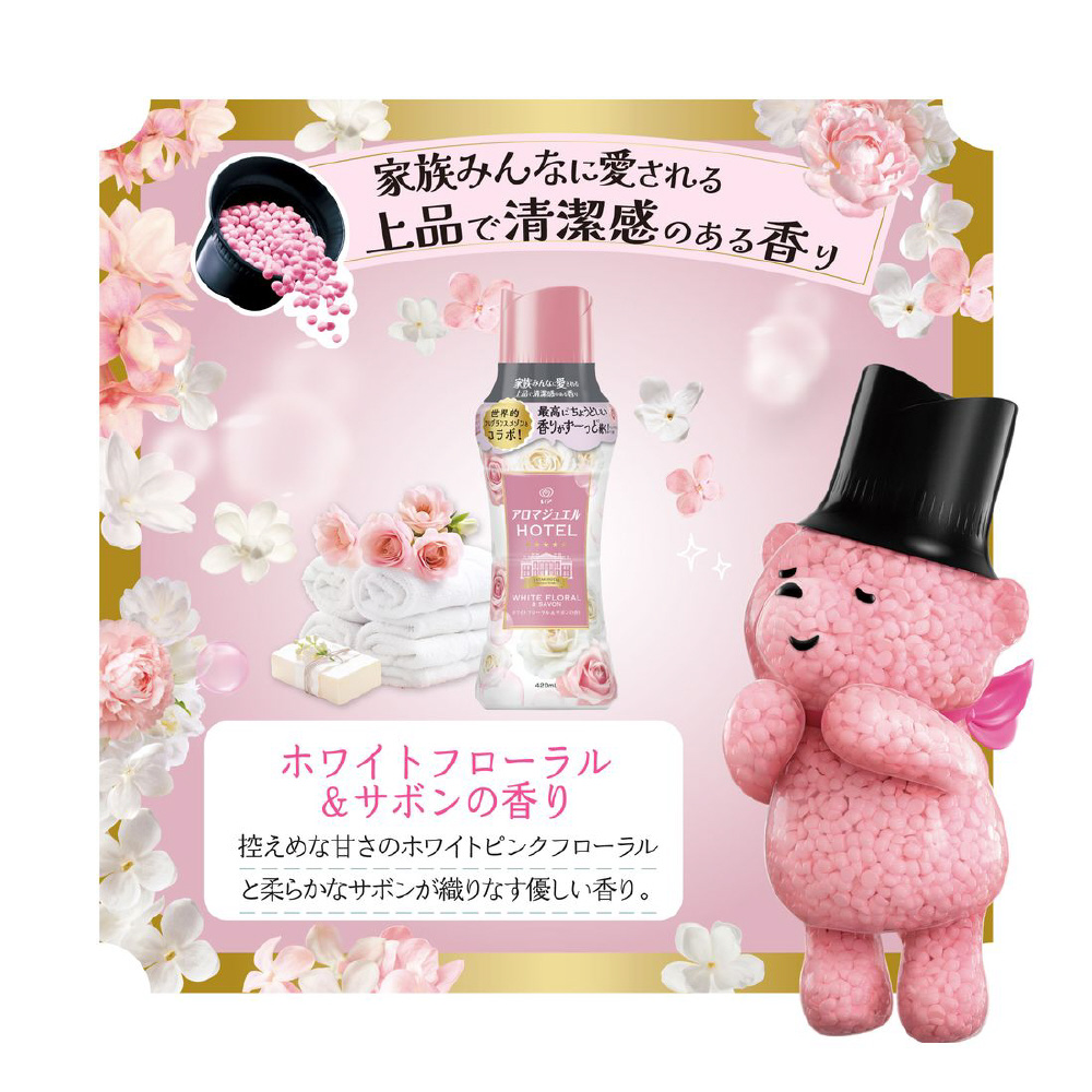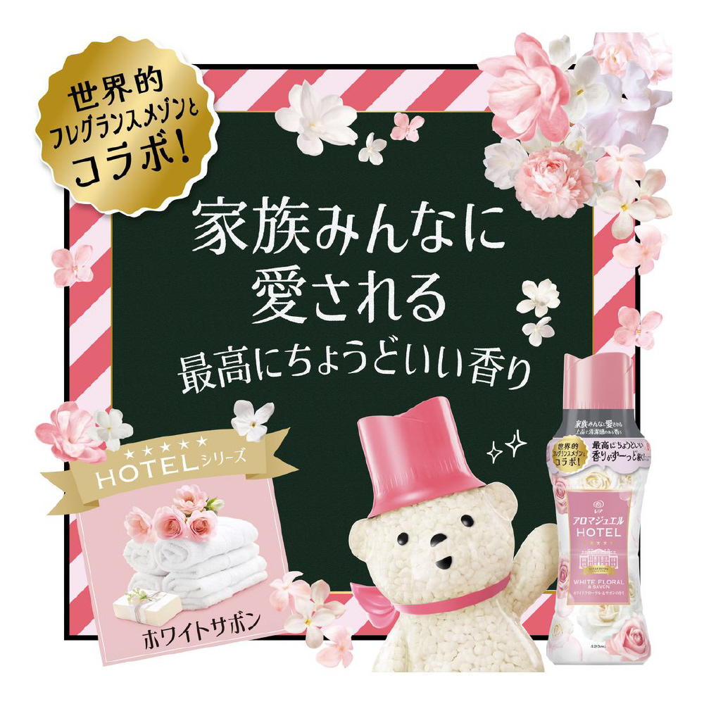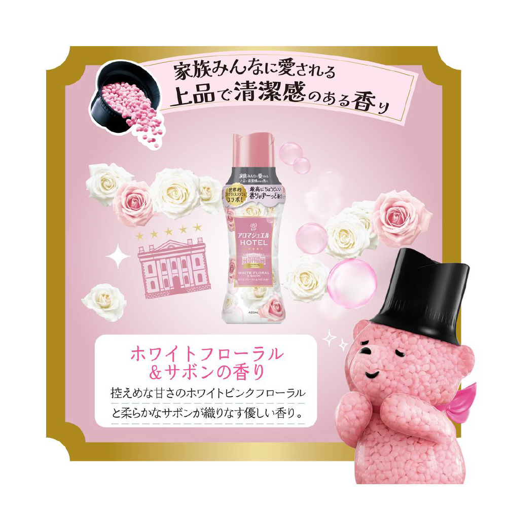 家族みんなに愛される上品で清潔感のある香り。最高に*1ちょうどいい香りがずーっと*2続く!上質なフレグラスサボンの香りを再現 ホワイトフローラル&サボンの香り: 控えめな甘さのホワイトピンクフローラルと柔らかなサボンが織りなす優しい香り。柔軟剤と比べて、超吸水*&香り長続きお洗濯のはじめに入れるだけ!*当社柔軟剤比。複数回洗濯後。*1 レノアアロマジュエル内 *2 1週間 香り付け専用ビーズ
