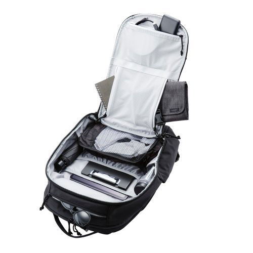 メイン気室には、前面側に上下2つのメッシュポケット、背面側にタブレットなどを収納できるオープンポケット、両側面にドリンクなどを収納できるオープンポケットを配置。持ち物をサイズや使用頻度に合わせて最適な場所に収納できます。