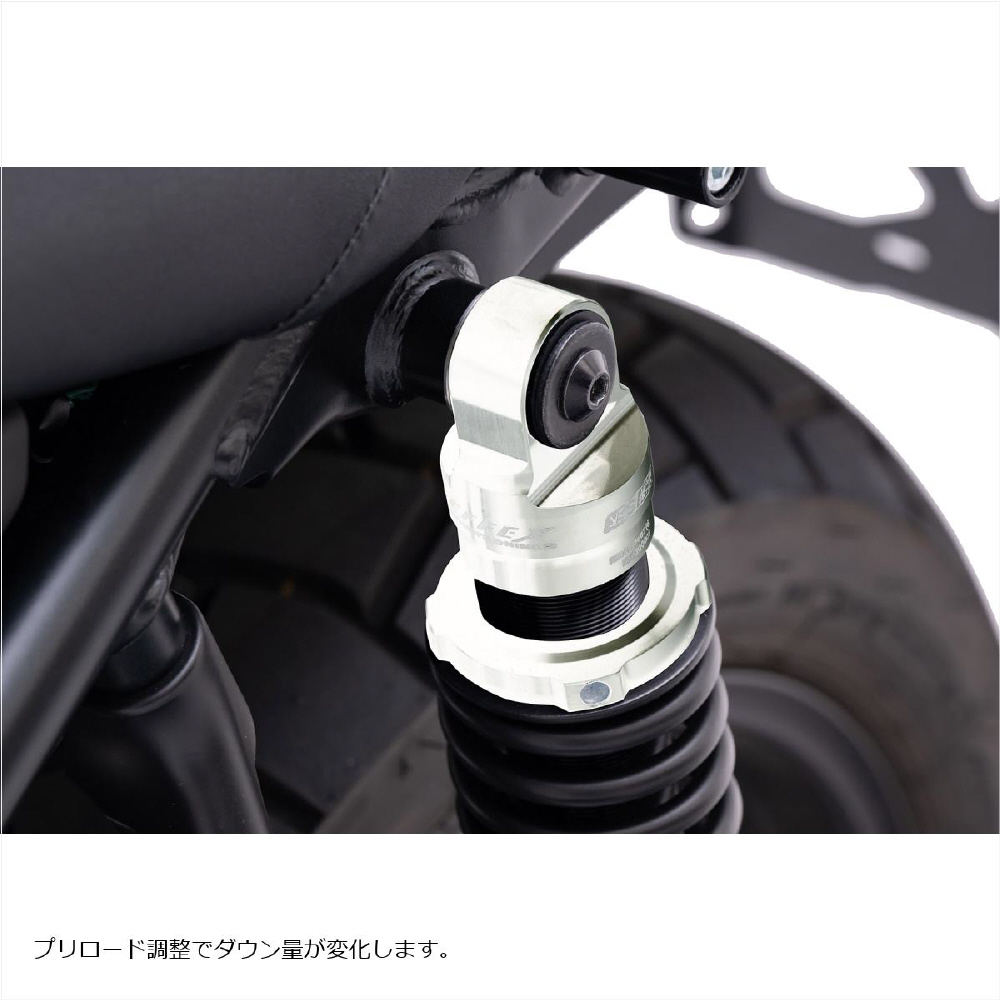 使用上の注意:ダウン量は、ライダー体重とプリロードアジャスタ位置で変化します。目安体重はライダーのヘルメット等を含む総装備重量で算出しています。ローダウンをさせることによって、ノーマルのサイドスタンドのままでの停車は、車体の傾きが起き気味になります。EFFEXショートサイドスタンドを併せてご装着下さい。また、適合車両、適合年式以外の車両へのご使用はお止め下さい。