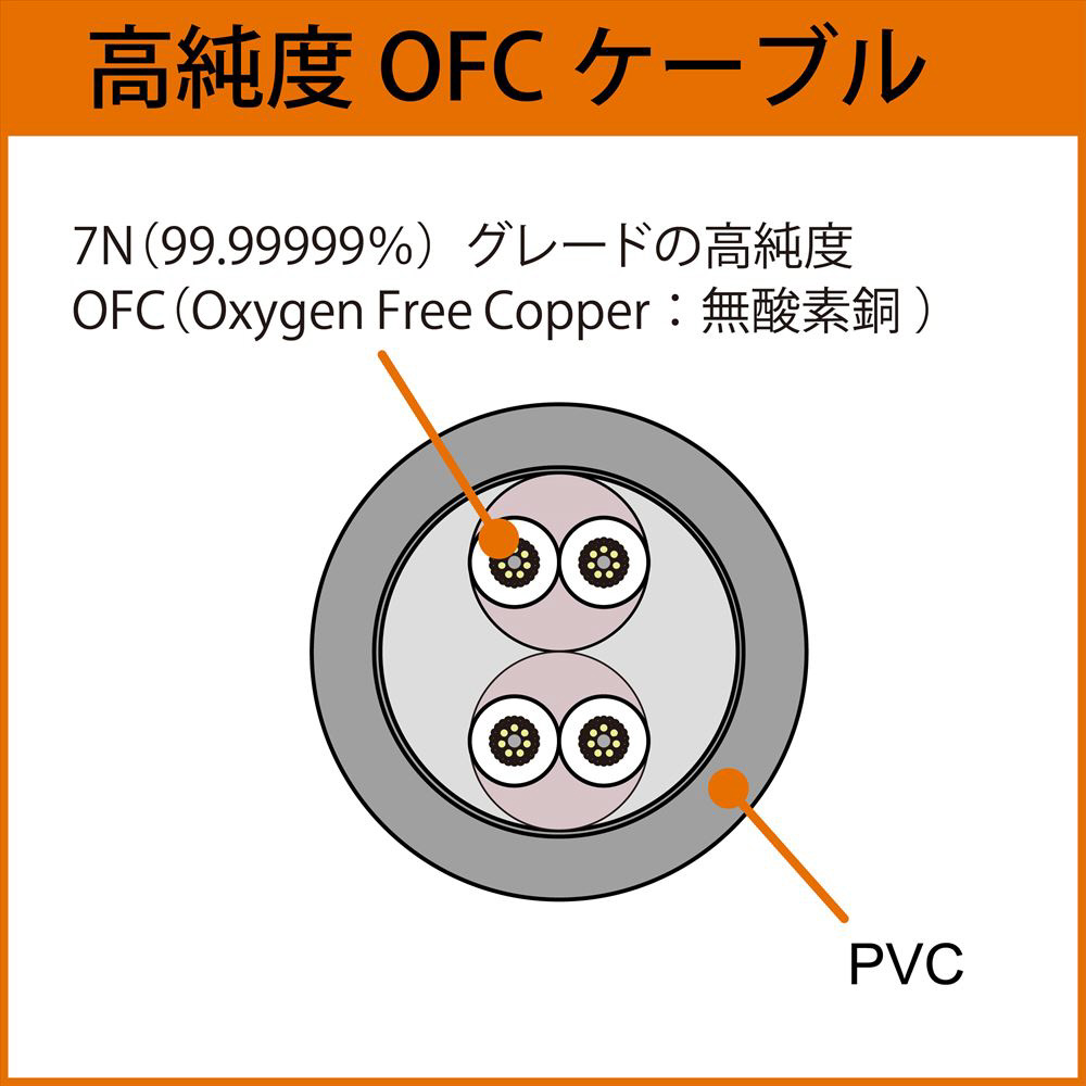 内部配線材と付属のアンバランス・ケーブルは不純物を極限まで排除し伝送能力を高めた7N(99.99999%)グレードの高純度OFC(Oxygen Free Copper:無酸素銅)ケーブルを採用しています。