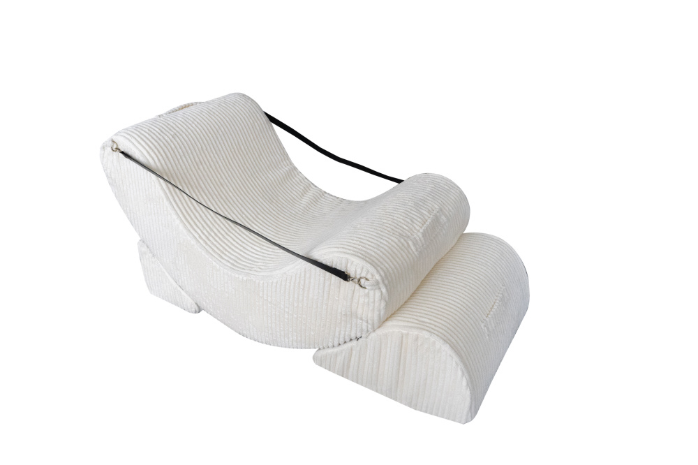 不思議な形をしたウレタンソファとオットマンのセット。人をダメにするゆったり癒しのソファです。