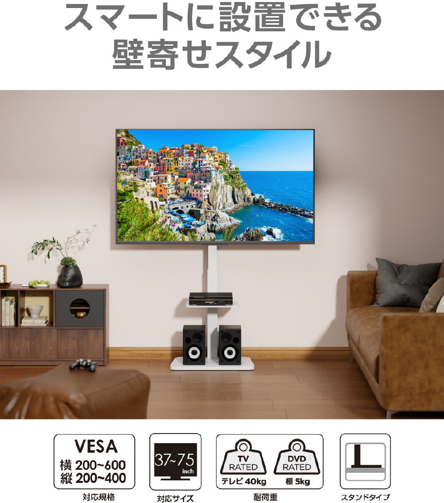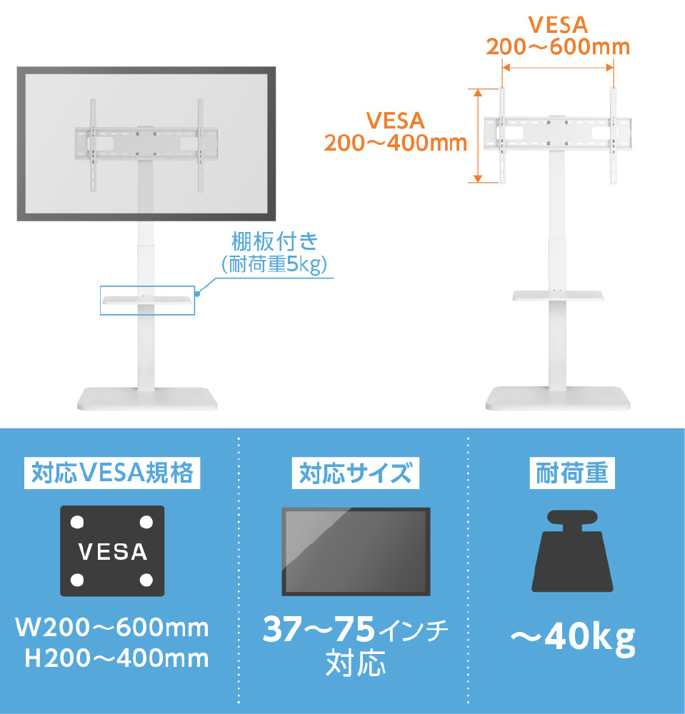 仕様1 ●対応サイズ 37〜75インチ ●耐荷重 〜40kg ●対応VESA W200〜600mm、H200〜400mm ●棚板耐荷重 5kg