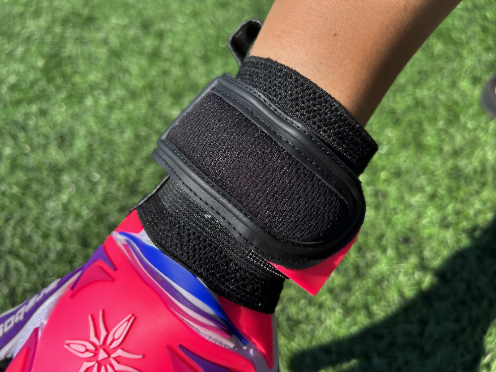 キーパーグローブを脱着する際、パームがマジックテープで傷つかないようにするためのTタブと呼ばれる加工。