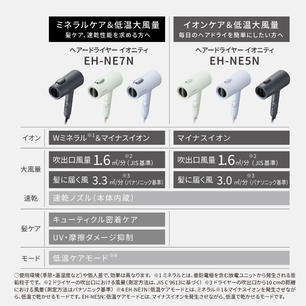 ※2、低温ケアモードとは、ミネラル・マイナスイオンを発生させながら、低温で乾かせるモードです。