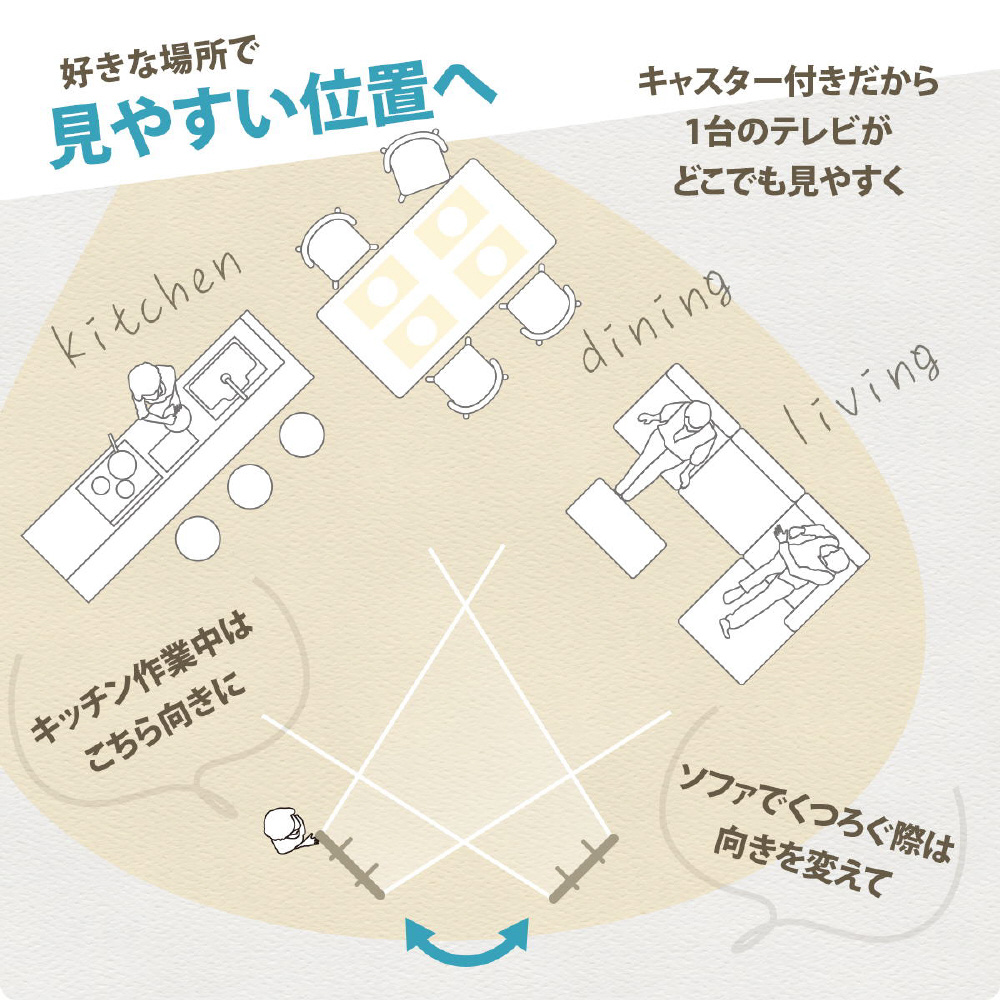 テレビを好きな場所でどこでも見やすい位置へ。お部屋間の移動やお掃除もラクラク簡単。