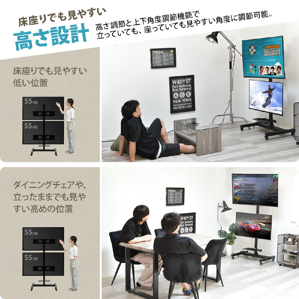 ディスプレイを上下2面、両面で設置できる本体耐荷重60kgのテレビスタンド(ディスプレイ1台のみの取付けは32〜65型まで)