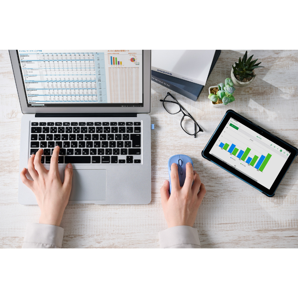 ■小さい凹凸やホコリがある環境でも正確にポインターを動かせるBlueLEDセンサーを搭載することで、木材・樹脂・ガラス製のデスクや、ノート、テーブルクロスの上などでも快適に操作できます。