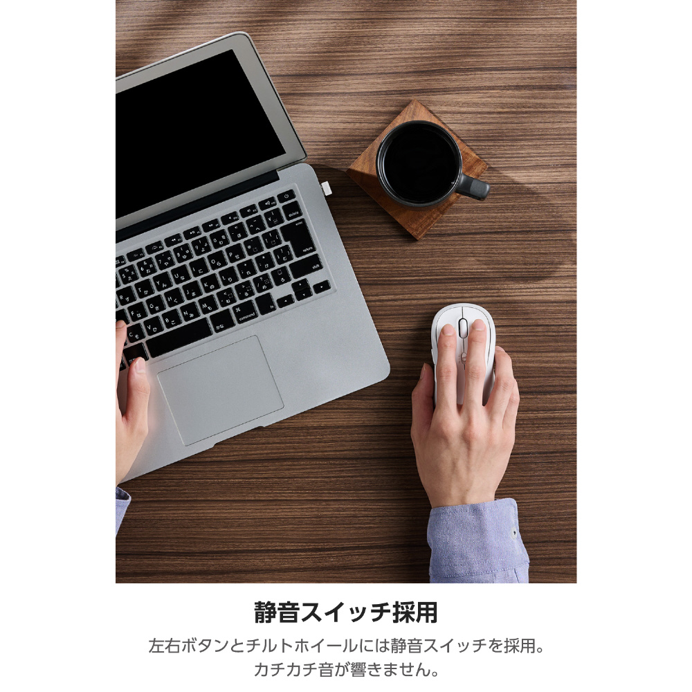 ■左右ボタンとチルトホイールには静音スイッチを採用。クリックしてもカチカチ音が響きません。ミーティング中やリビング・カフェ、シェアオフィスなど周りに人がいる場面でも音を気にせず使えます。