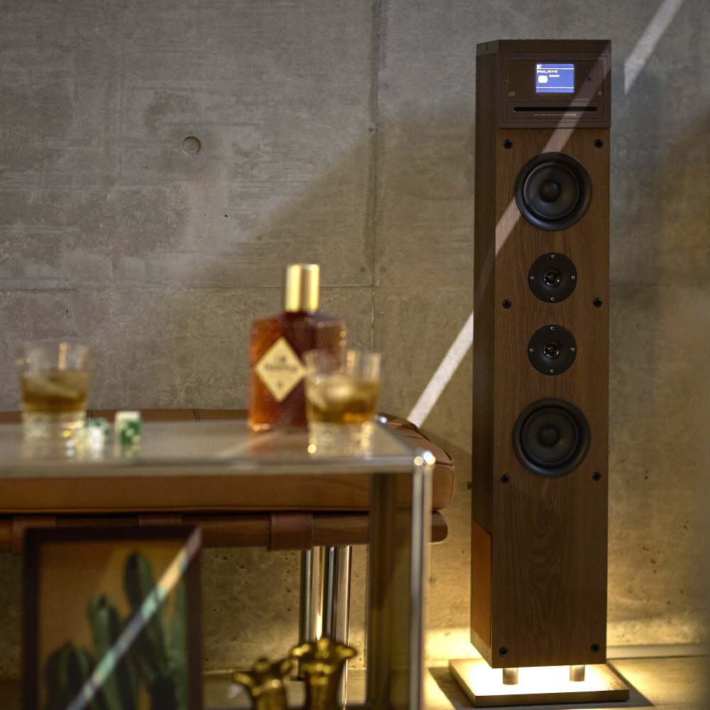 細身の縦長フォルムに、CDプレーヤーやBluetooth、FMラジオ、ワイヤレス充電など多彩な機能を凝縮しました。